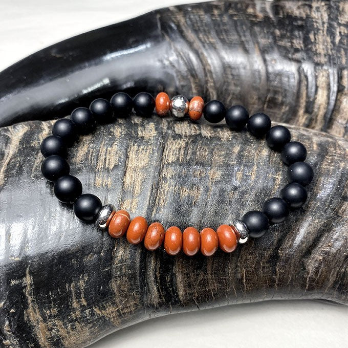 Bracelet pour homme en pierre naturelle (onyx noir mat et jaspe rouge) avec des éléments décoratifs en acier inoxydable blanc*