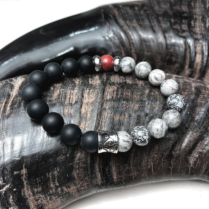 Bracelet pour homme en pierre naturelle( onyx noir mat et jaspe) avec des éléments décoratifs en acier inoxydable blanc*