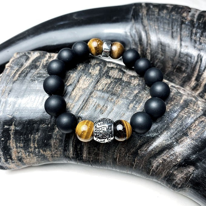 Bracelet pour homme en pierre naturelle (onyx mat et oeil de tigre) avec des éléments décoratifs en acier inoxydable blanc*