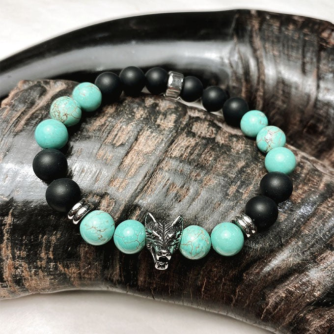Bracelet pour homme en pierre naturelle (onyx mat et howlite turquoise) avec des éléments décoratifs en acier inoxydable blanc*