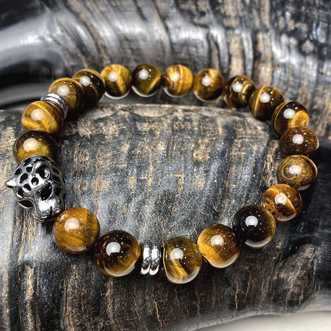 Bracelet pour homme en pierre naturelle (oeil de tigre) avec des éléments décoratifs en acier inoxydable blanc*