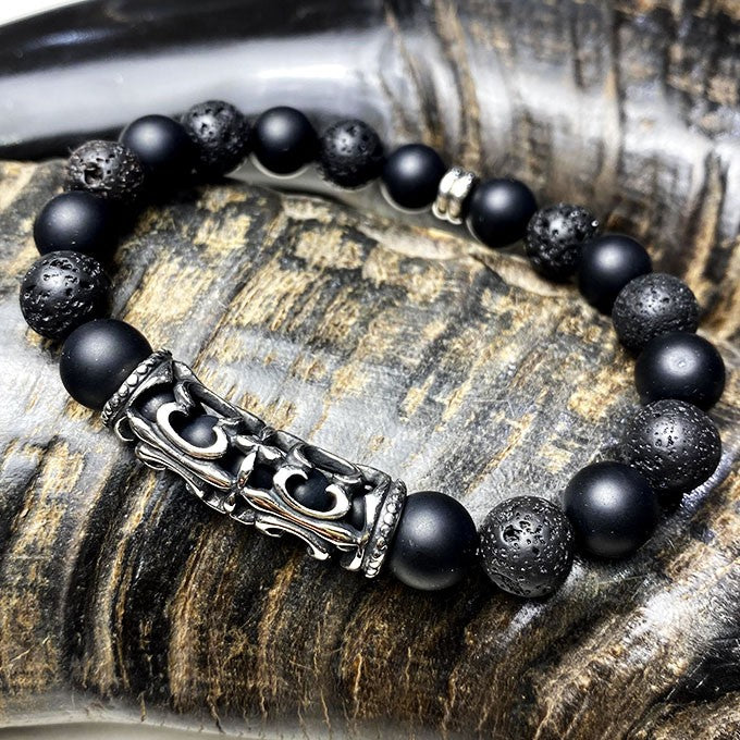 Bracelet pour homme en pierre naturelle (pierre de lave et onyx mat) avec des éléments décoratifs en acier inoxydable*