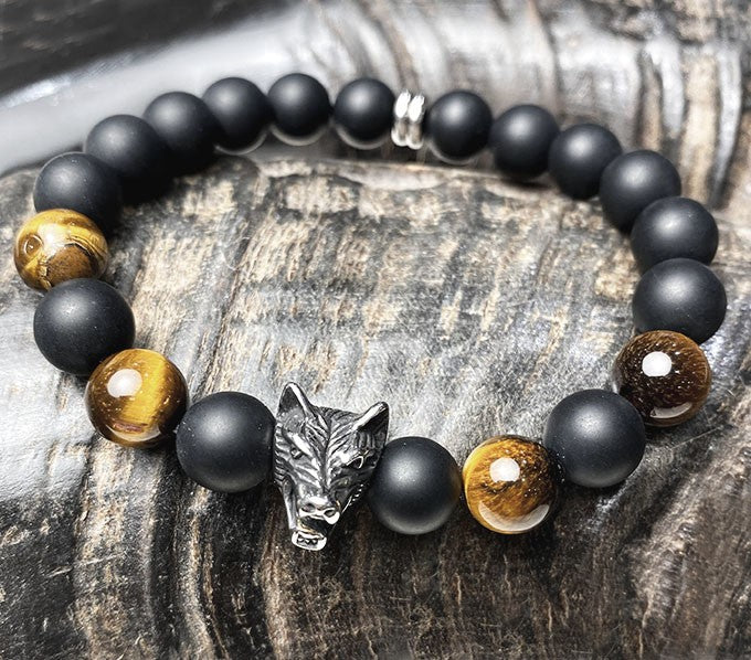 Bracelet pour homme en pierre naturelle (onyx mat et oeil de tigre) avec des éléments décoratifs en acier inoxydable blanc*