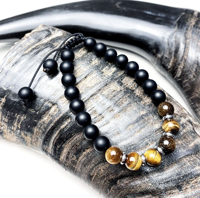 Bracelet réglable pour homme en pierre naturelle (onyx noir mat et oeil de tigre) avec des rondelles décorative en acier inoxydable blanc.