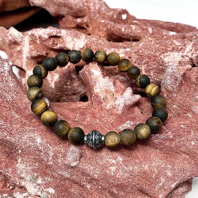 Bracelet pour homme en pierre naturelle (oeil de tigre mat) avec un élément décoratif en acier inoxydable blanc*