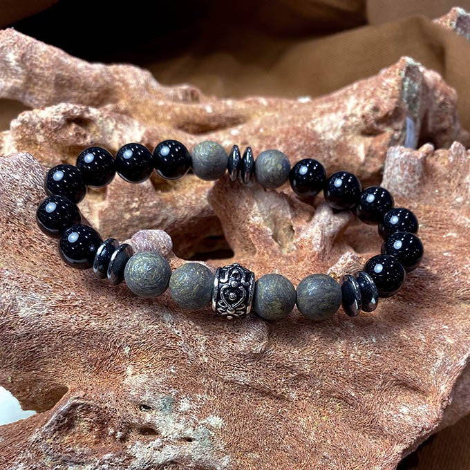 Bracelet pour homme en pierre naturelle (bronzite et onyx en noir) avec des éléments décoratifs en acier inoxydable blanc.
