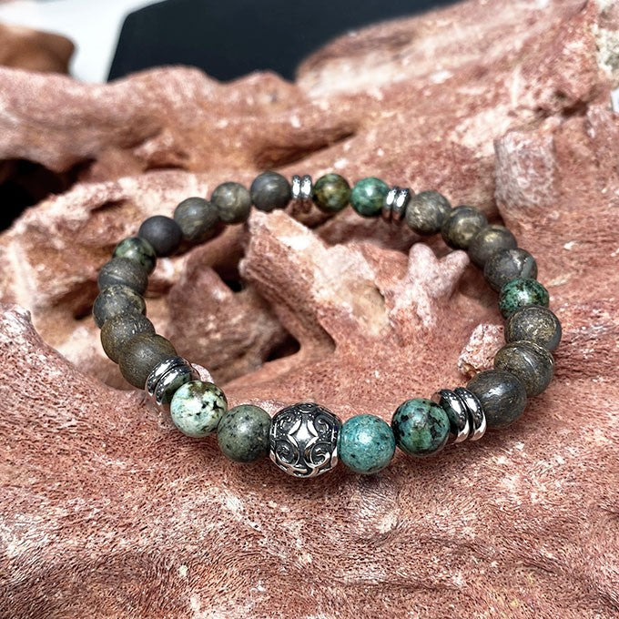 Bracelet pour homme en pierre naturelle (bronzite mat et turquoise africaine) avec des éléments décoratifs en acier inoxydable blanc.