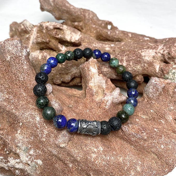 Bracelet pour homme en pierre naturelle (pierre de lave et turquoise africaine) avec un élément décoratif en acier inoxydable blanc*