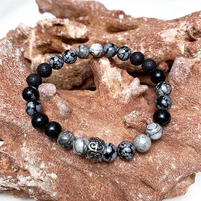 Bracelet pour homme en pierre naturelle(pierre de lave et obsidienne neige) avec un élément décoratif en acier inoxydable blanc.