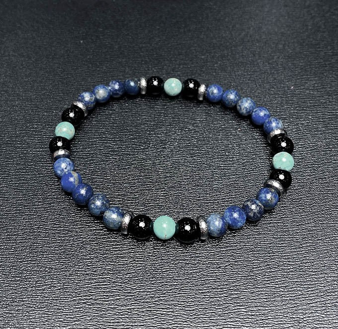Bracelet pour homme en pierre naturelle (lapis, onyx noir et howlite turquoise) avec des rondelles décoratives en acier inoxydable blanc.