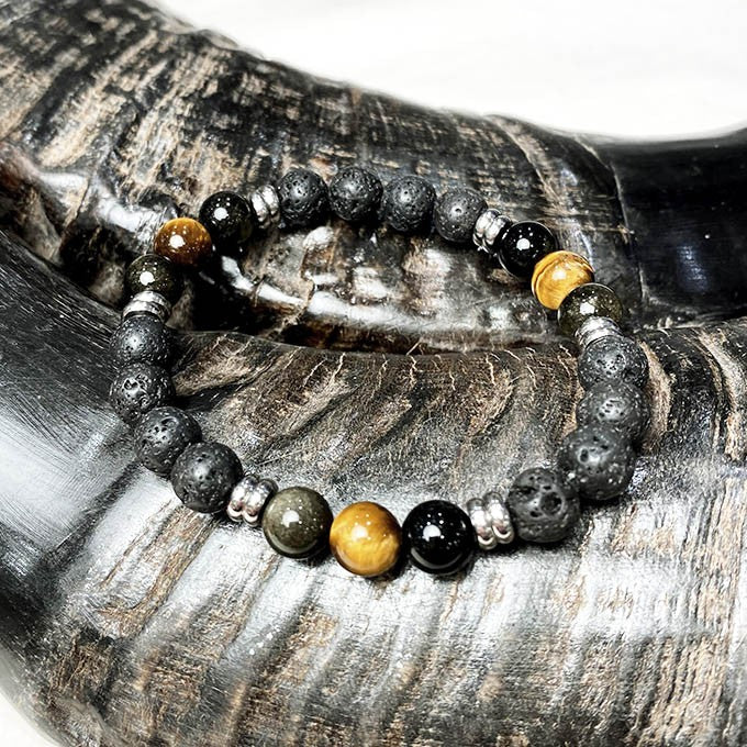 Bracelet pour homme en pierre naturelle (œil de tigre et pierre de lave) avec des rondelles décoratives en acier inoxydable blanc.