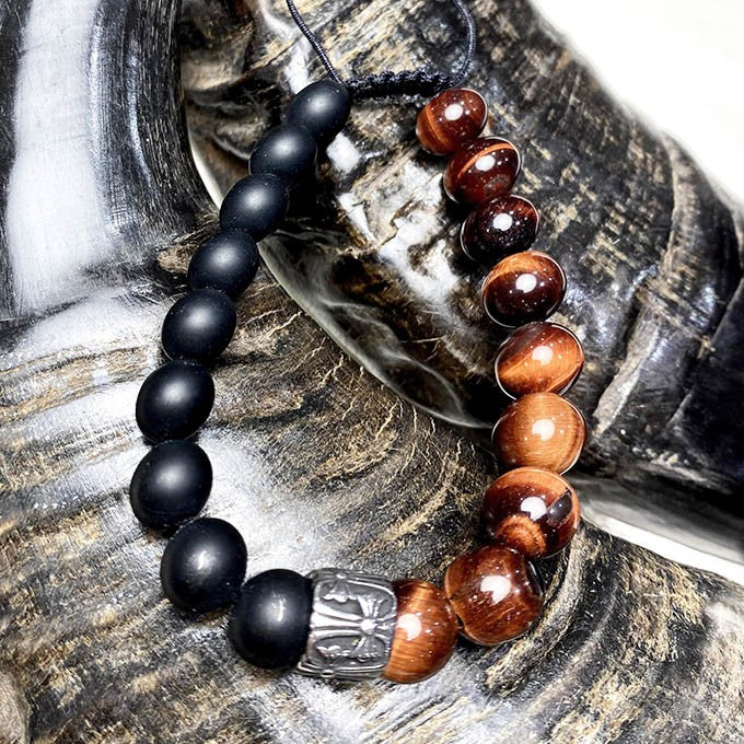 Bracelet réglable pour homme en pierre naturelle (onyx noir mat + oeil de taureau en 10mm) orné de son élément décoratif en acier inoxydable