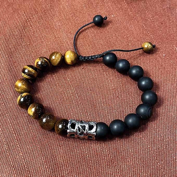 Bracelet réglable pour homme en pierre naturelle (onyx noir mat et œil de tigre) avec un élément décoratif en acier inoxydable blanc.