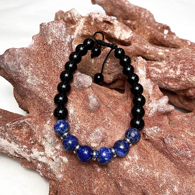 Bracelet réglable pour homme en pierre naturelle (onyx noir et lapis) avec des rondelles décoratives en acier inoxydable blanc.