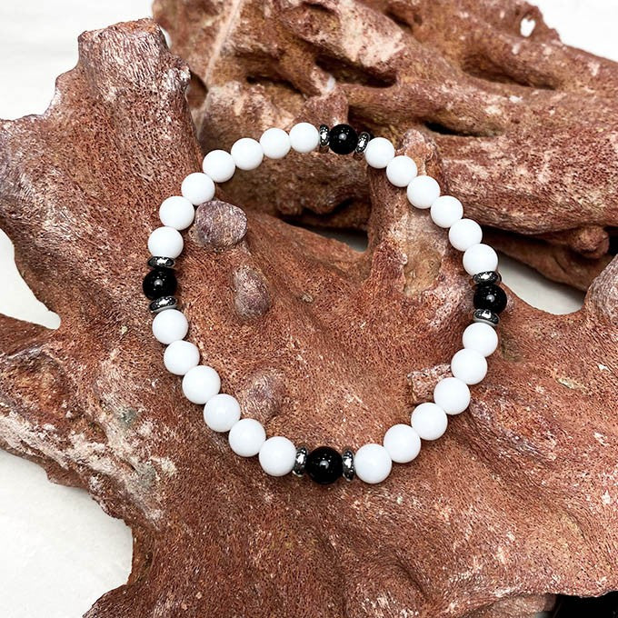 Bracelet pour homme en pierre naturelle (céramique blanche et onyx noir) avec des rondelles décoratives en acier inoxydable blanc.