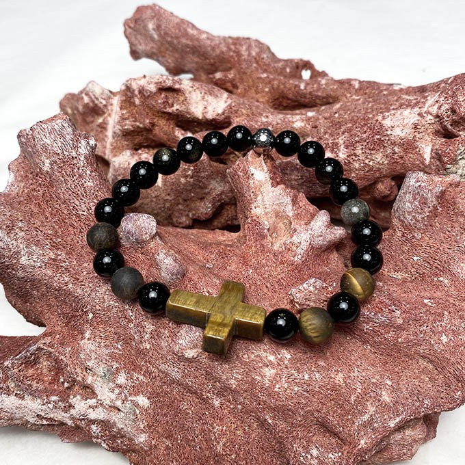 Bracelet pour homme en pierre naturelle (obsidienne et œil de tigre) orné d'un élément décoratif en acier inoxydable blanc.