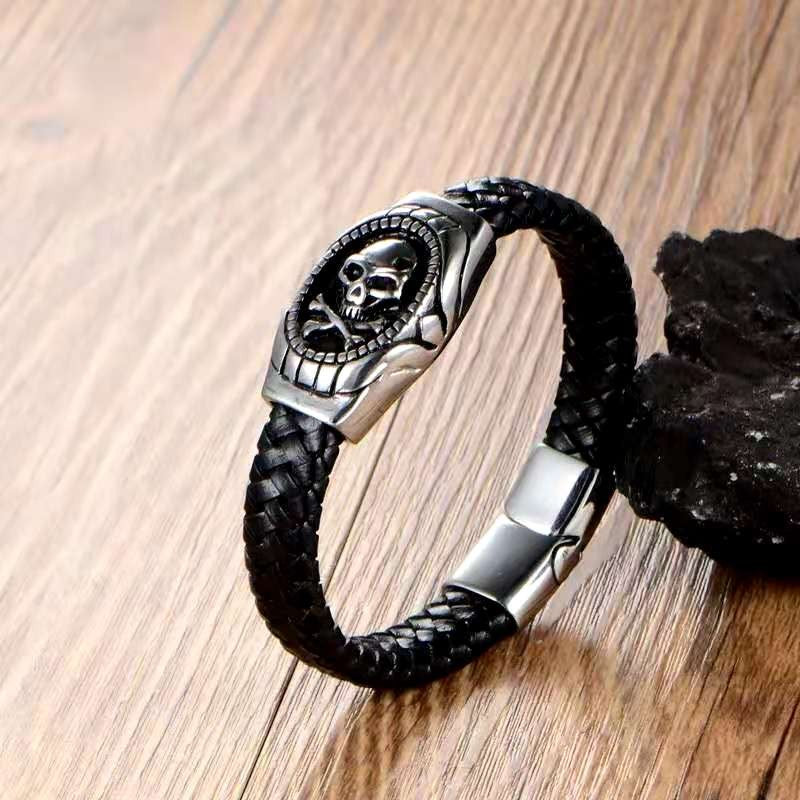 Bracelet Homme Cuir Et Tête De Mort En Acier