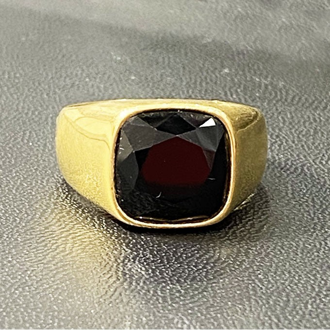 Bague chevalière en acier inoxydable doré avec une pierre en verre noir, disponible en plusieurs taille.