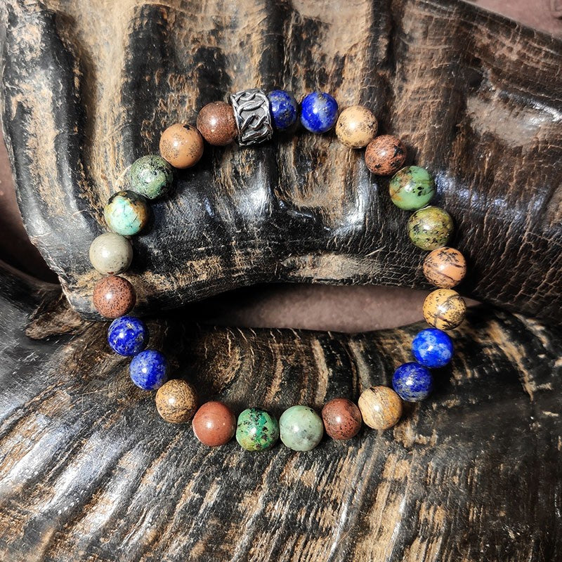Bracelet homme en pierre naturelle (lapis, turquoise africaine et jaspe) avec un élément décoratif en acier inoxydable blanc.