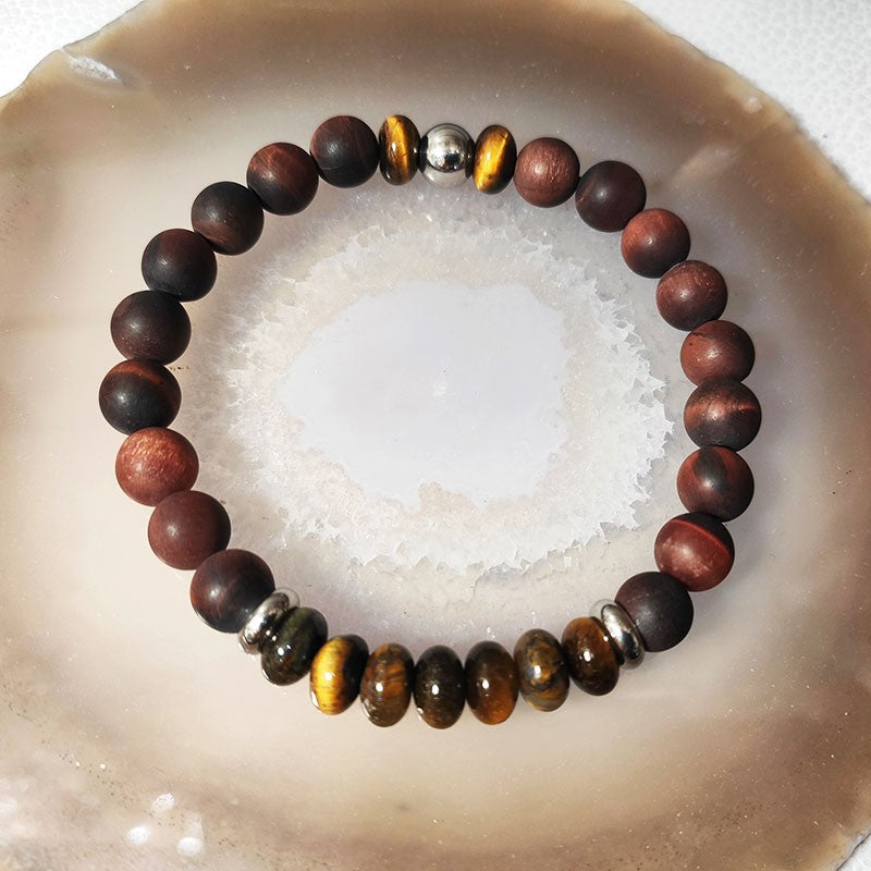 Bracelet homme en pierre naturelle (œil de taureau mate et œil de tigre) avec des éléments décoratifs en acier inoxydable blanc.