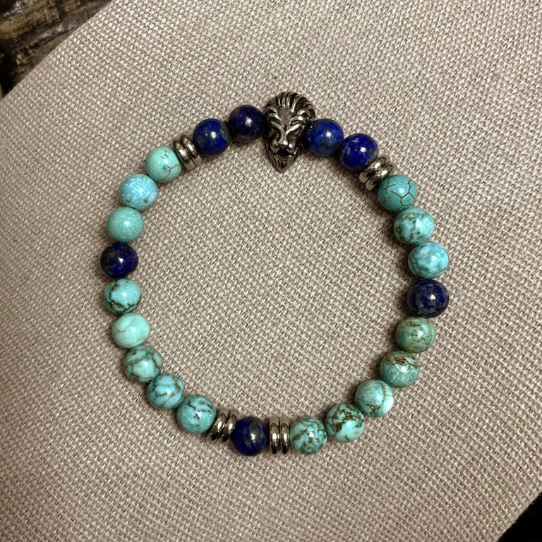 Bracelet pour homme en pierre naturelle (howlite bleue et lapis) avec des éléments décoratifs en acier inoxydable blanc*