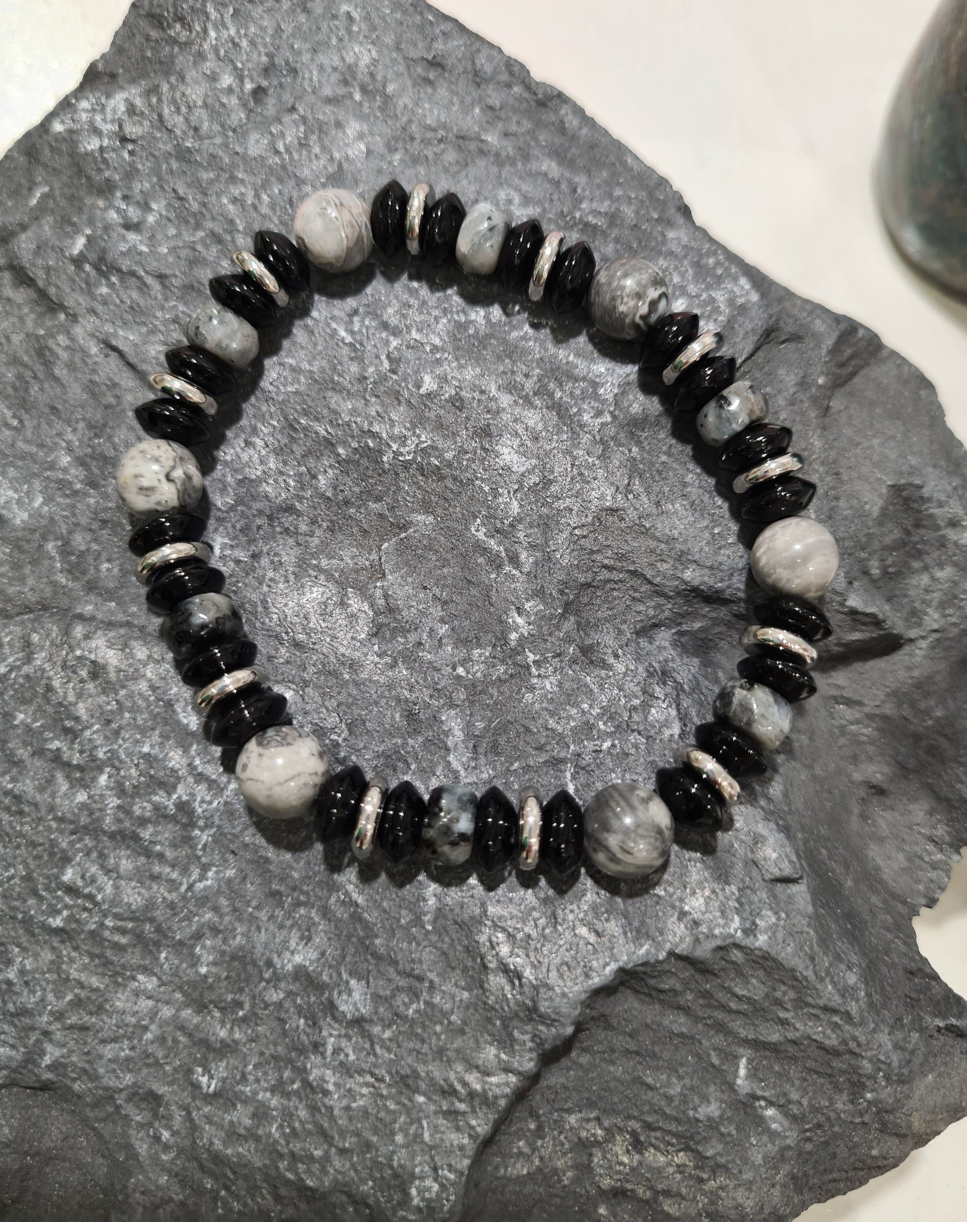 Bracelet en pierre naturelle (jaspe gris et onyx noir bouton) avec des rondelles en acier inoxydable blanc.