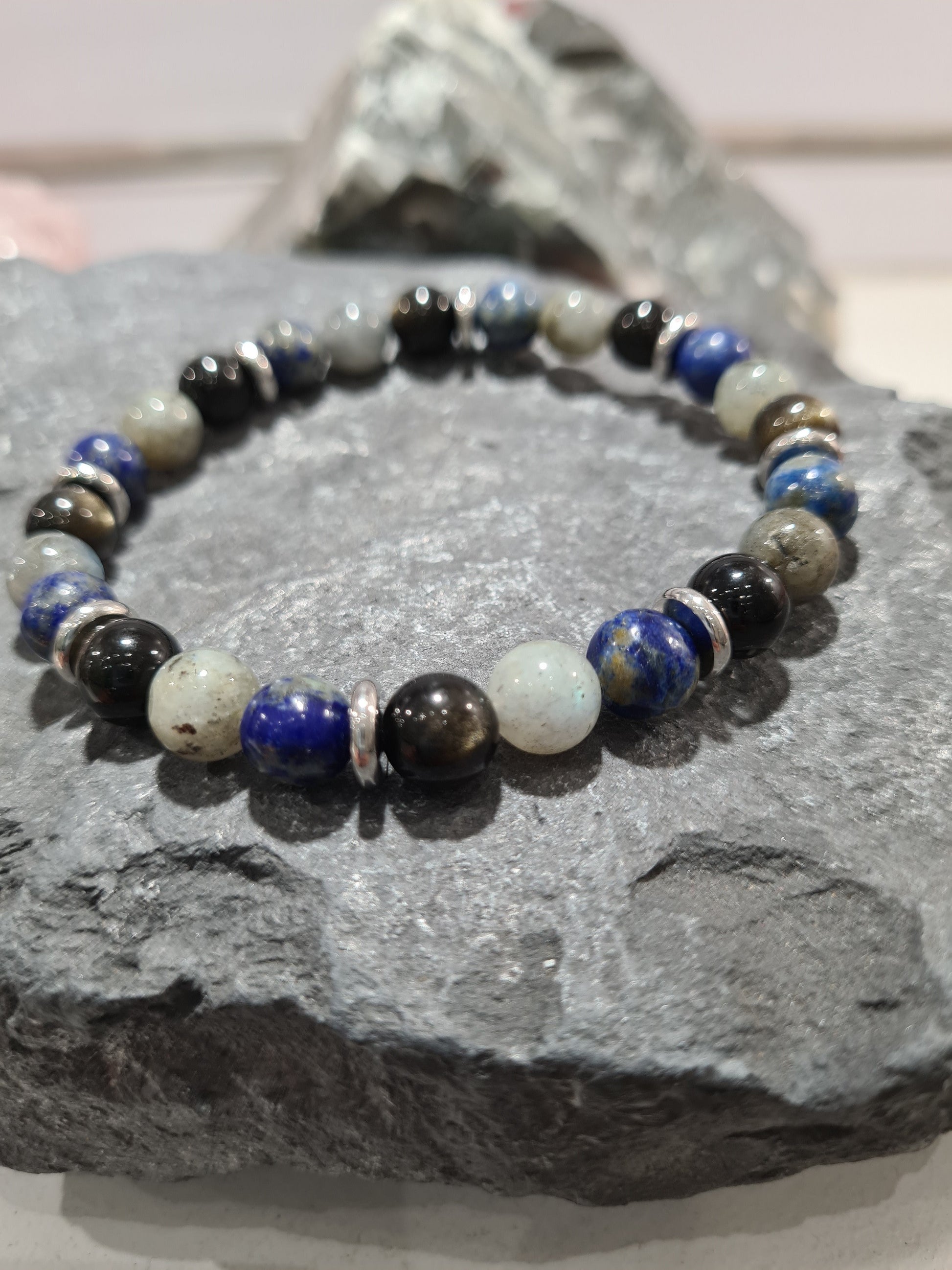 Bracelet en pierre naturelle (lapis lazuli, onyx noir et larvikite) avec des rondelles en acier inoxydable blanc.