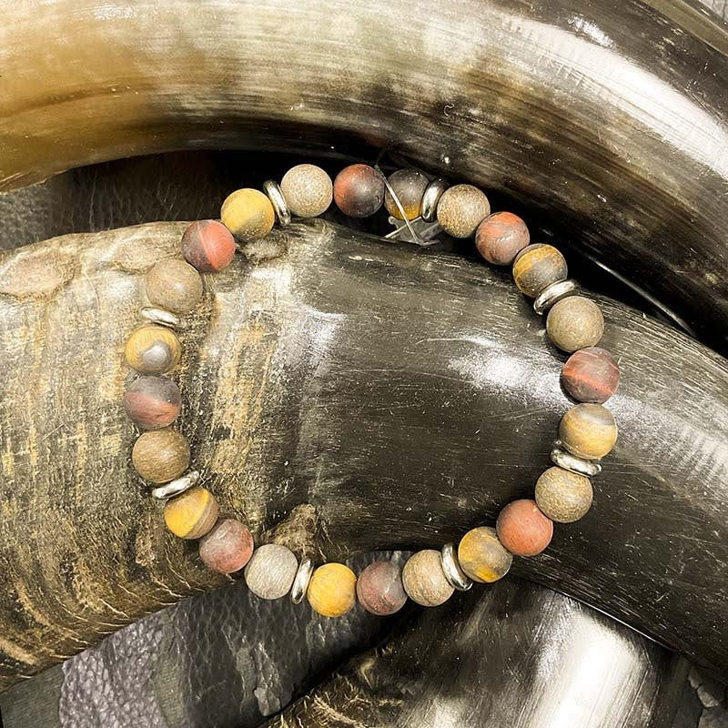 Bracelet en pierre naturelle (bronzite, oeil de tigre et oeil de taureau) avec les rondelles en acier inoxydable blanc