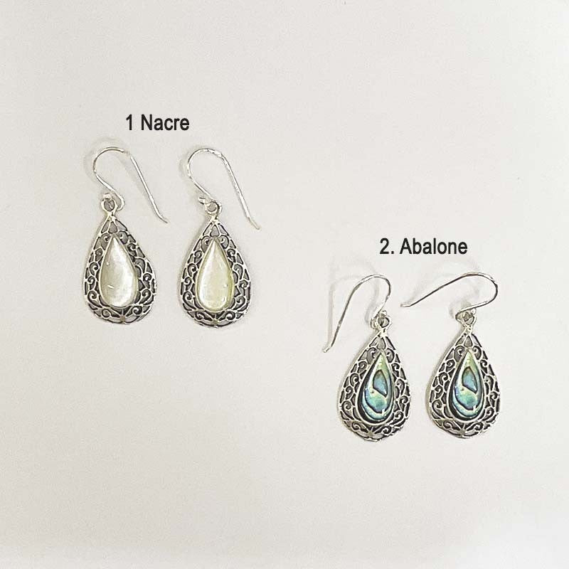 Boucles d'oreilles faites en argent 925 en forme de goutte, disponible en modèles: nacre ou abalone.