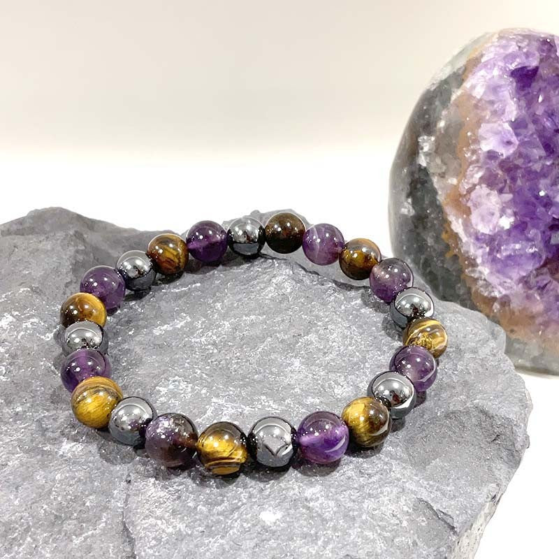 Bracelet en pierre naturelle d'améthyste, œil de tigre et hématite en 8mm.