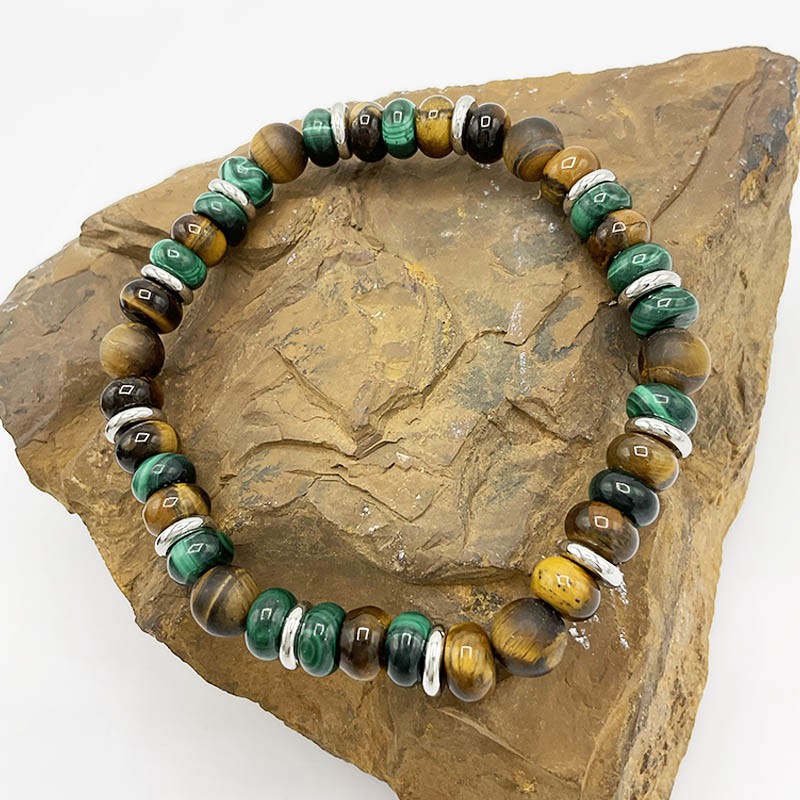 Fait de pierres naturelles ( œil de tigre et malachite ) avec des disques en acier inoxydable