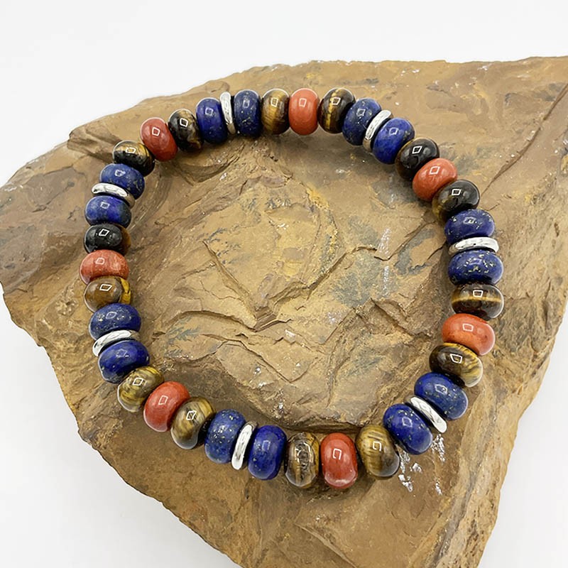 Fait de pierres naturelles ( œil de tigre, jaspe et lapis ) avec des disques en acier inoxydable