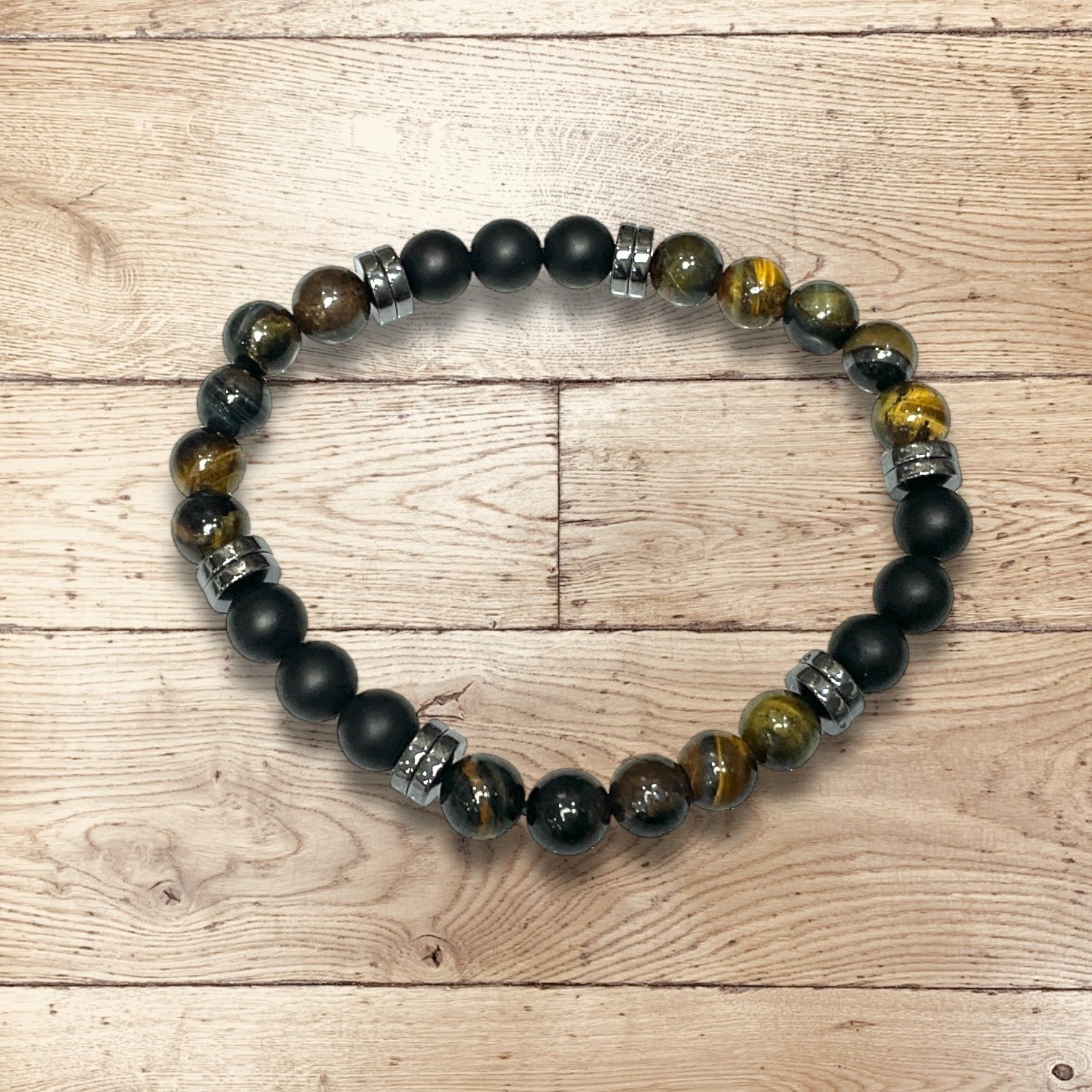Bracelet Homme Pierre Naturelle D'Oeil De Tigre, Onyx Mate, Mematite Bouton 8mm