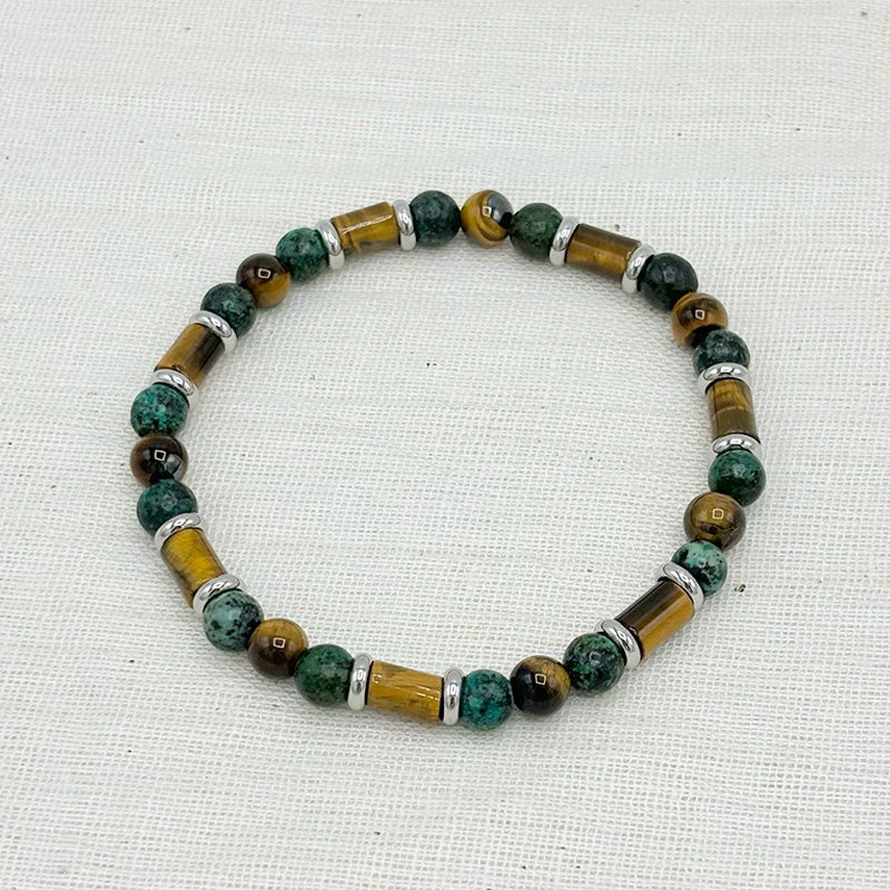 Bracelet en pierre naturelle d'œil de tigre et turquoise africaine avec des boutons en acier inoxydable blanc.