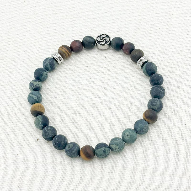 Bracelet en pierre naturelle de jaspe, oeil de tigre et oeil de taureau avec des éléments décoratifs en acier inoxydable blanc.