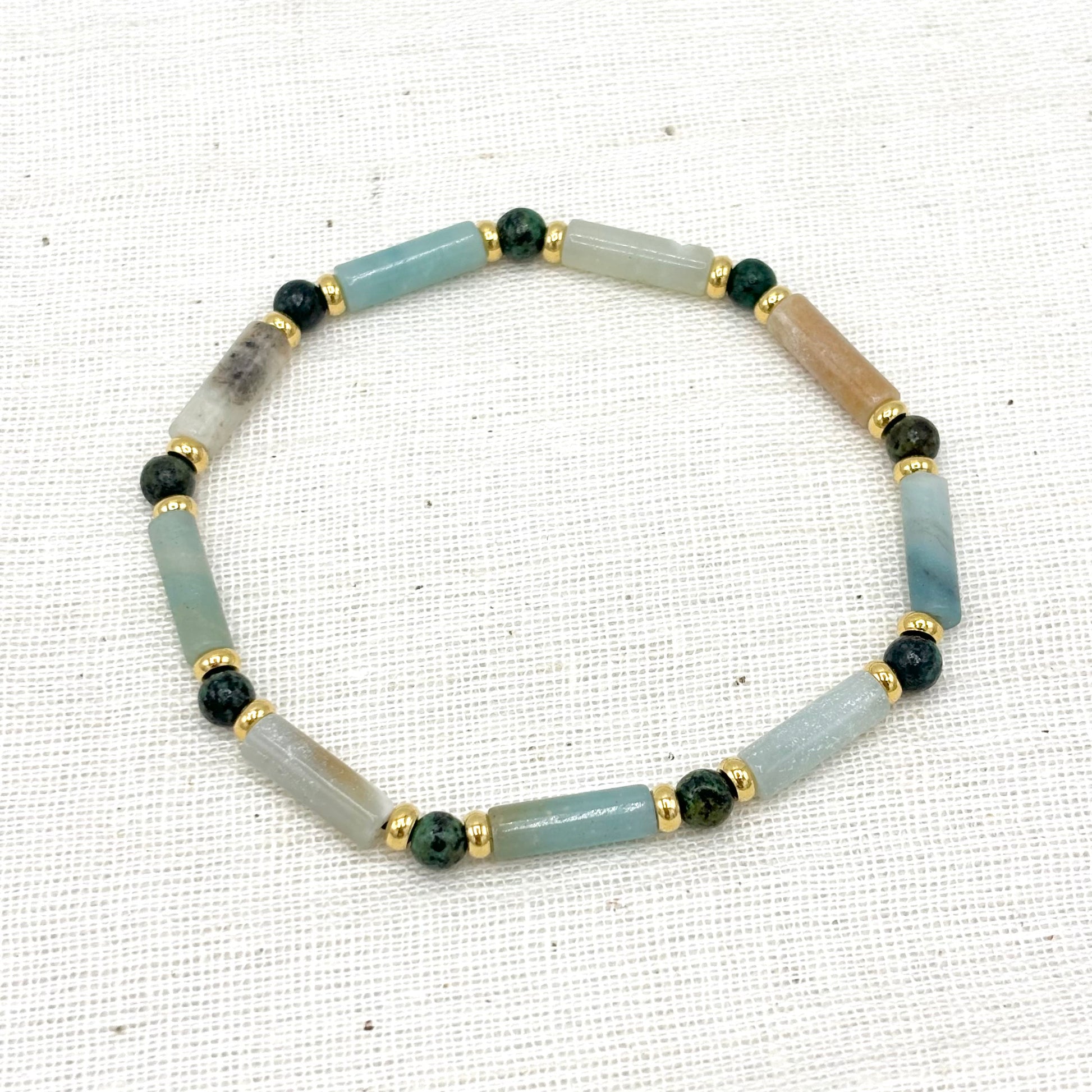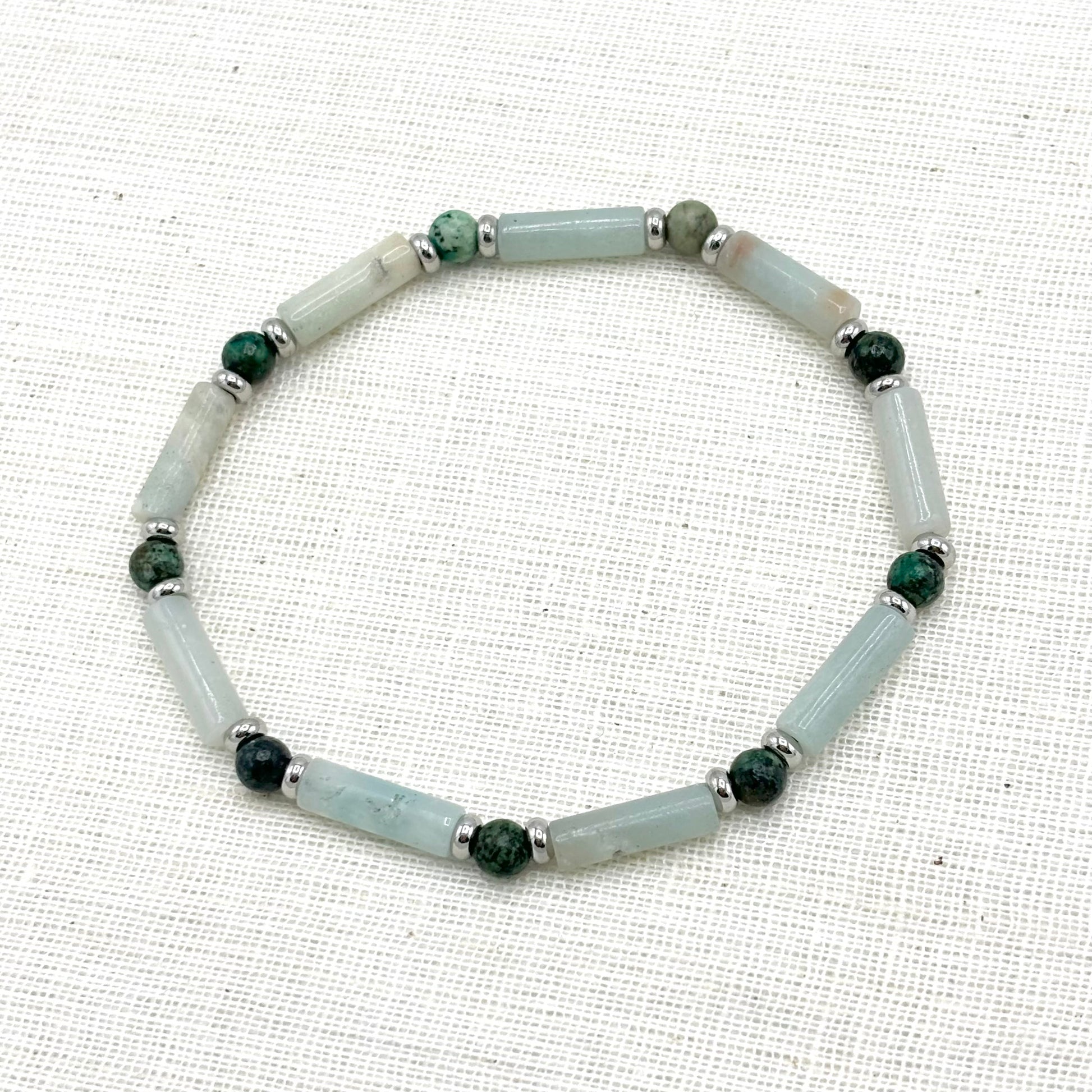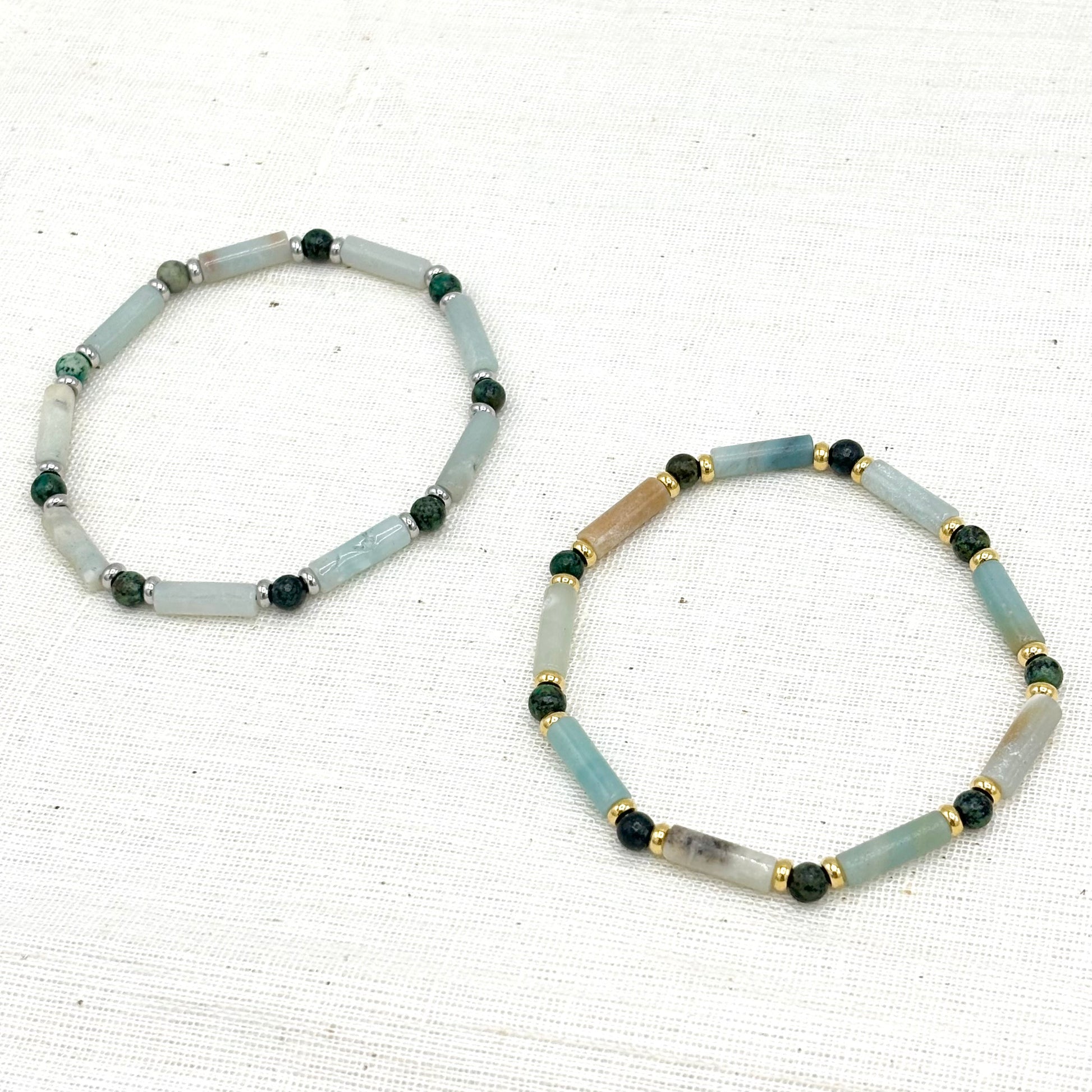 Bracelet en pierre naturelle d'amazonite et de turquoise africaine avec des boutons en acier inoxydable blanc ou doré.