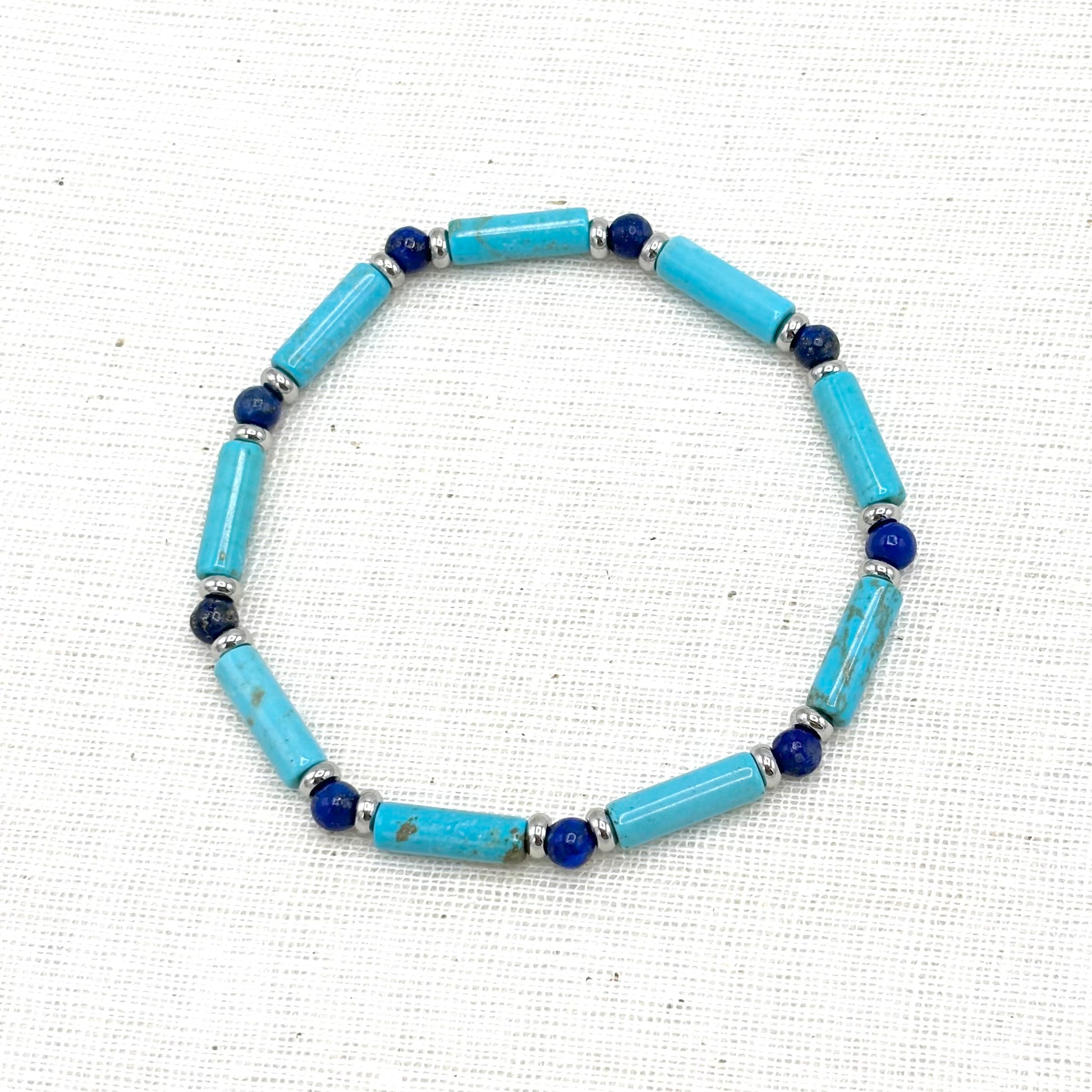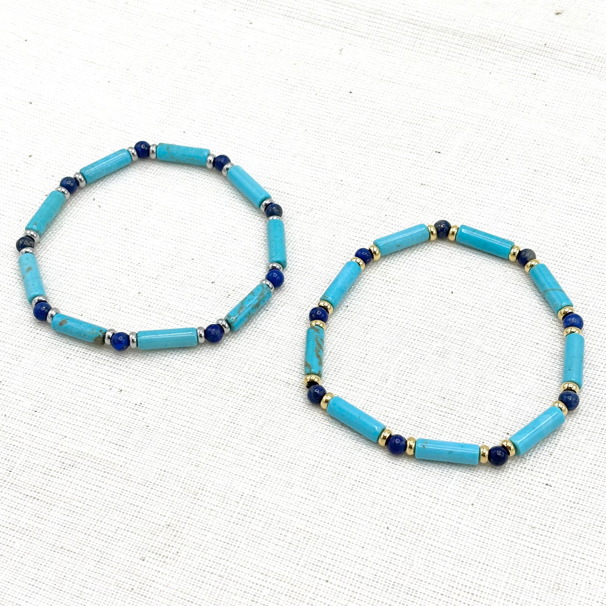 Bracelet en pierre naturelle d'howlite bleu et de lapis-lazuli avec des boutons en acier inoxydable blanc ou doré.