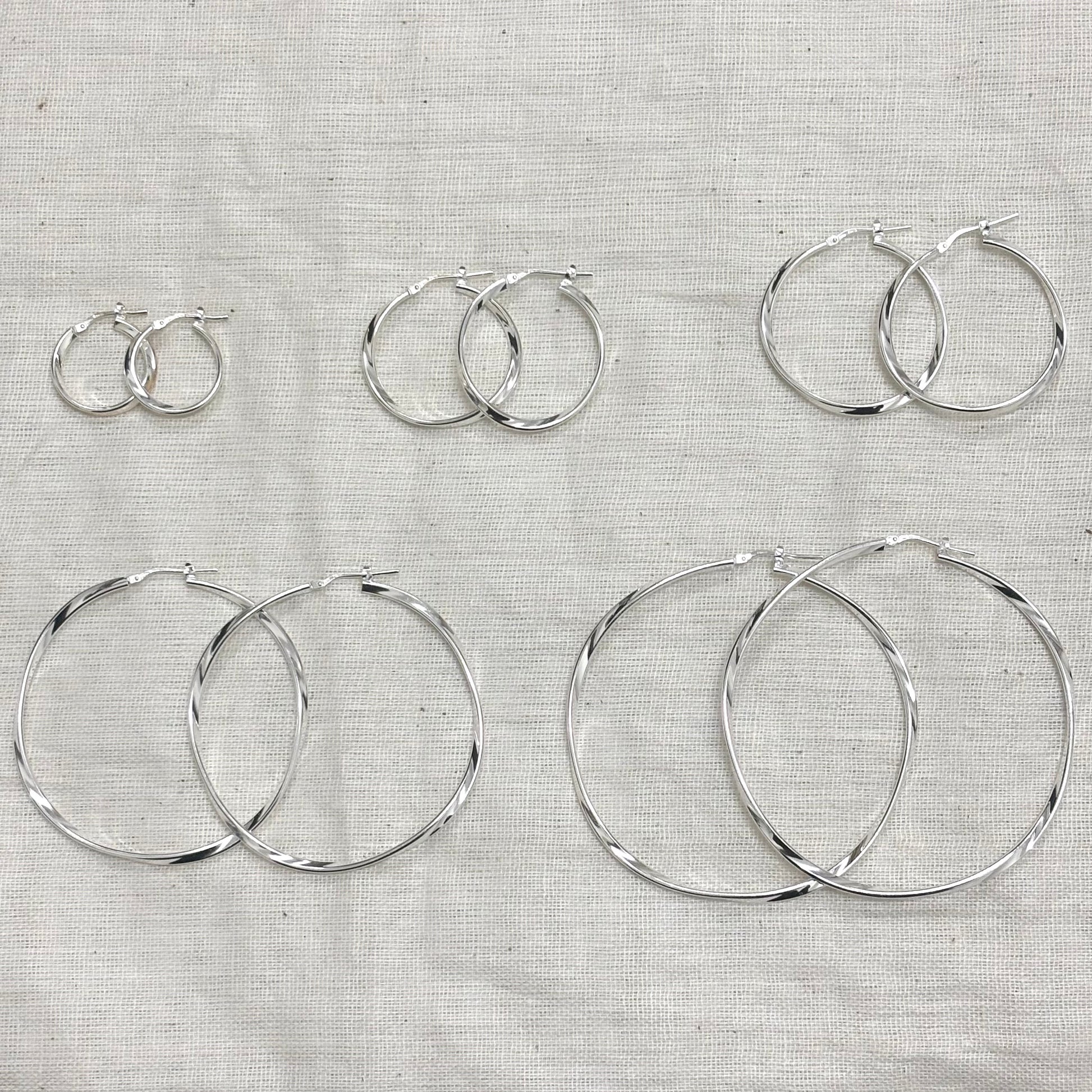 Boucles d'oreilles créoles torsade en argent 925, disponible en plusieurs diamètre: 15mm, 25mm, 30mm, 50mm, 60mm.
