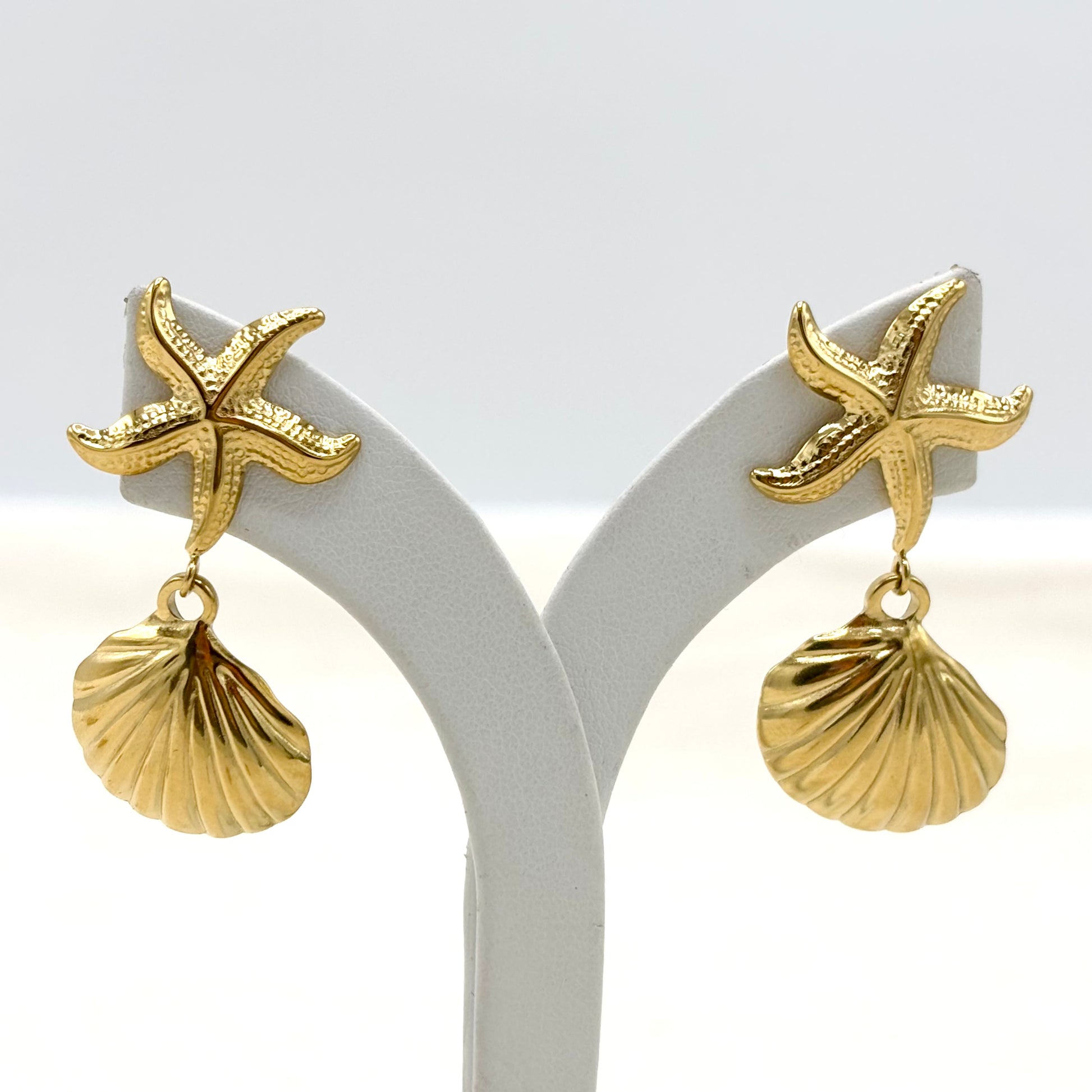 Boucles d'oreilles avec une étoile de mer et coquillage en acier inoxydable doré