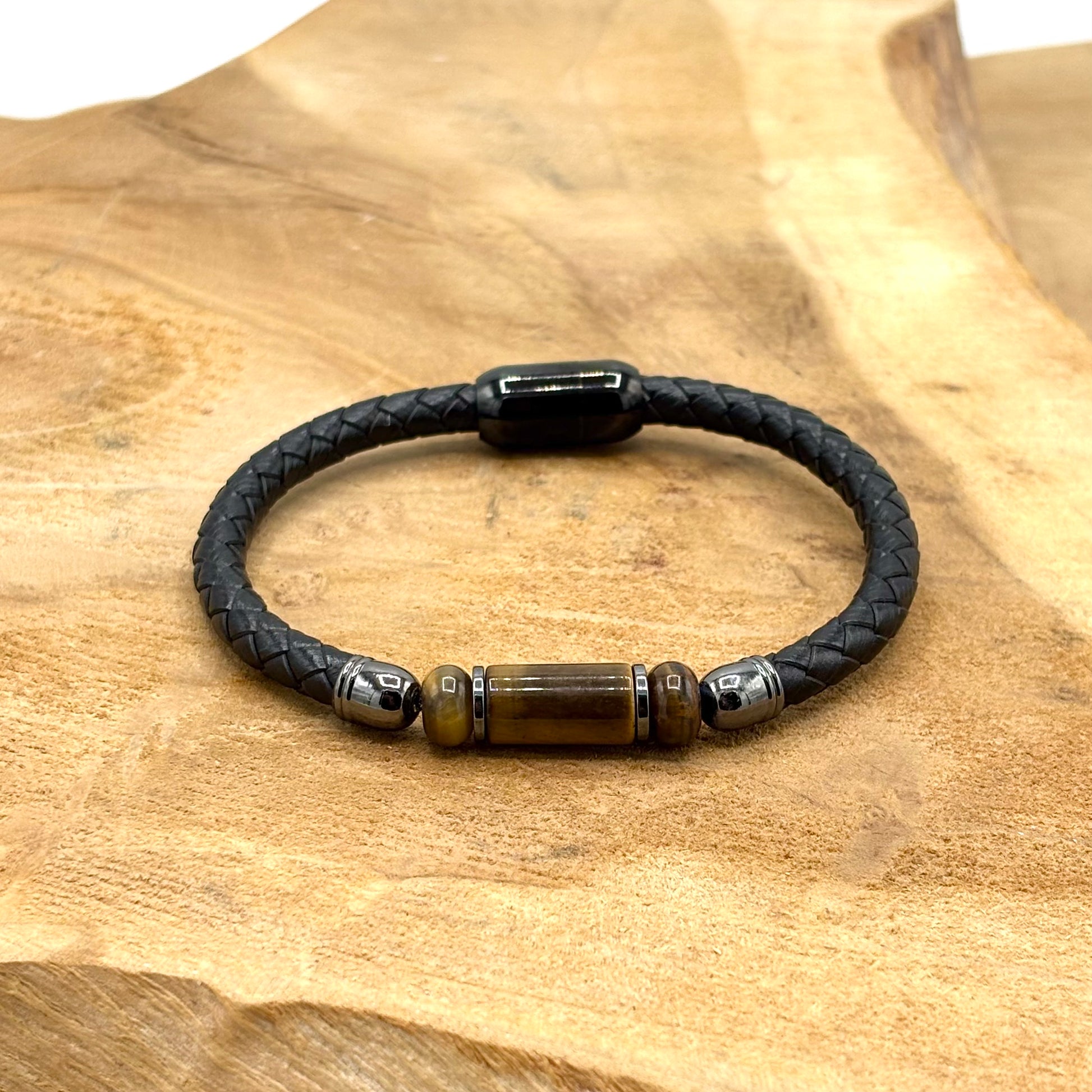 Bracelet en cuir avec un fermoir en acier inoxydable noir magnétique et des pierres naturelle d'œil de tigre.
