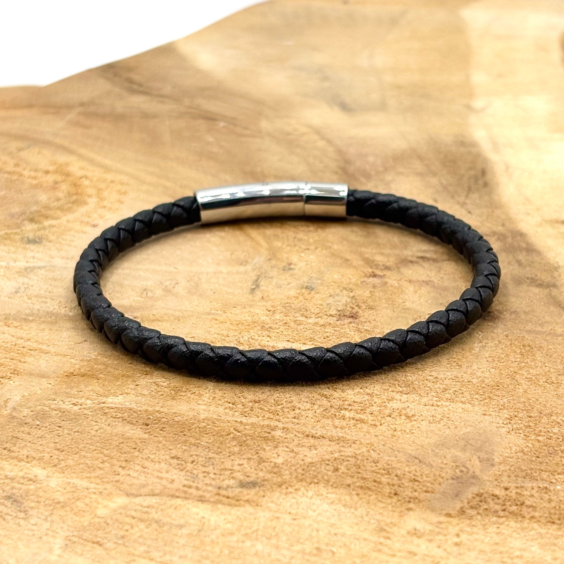Bracelet en cuir avec un fermoir en acier inoxydable blanc, disponible en noir ou marron.