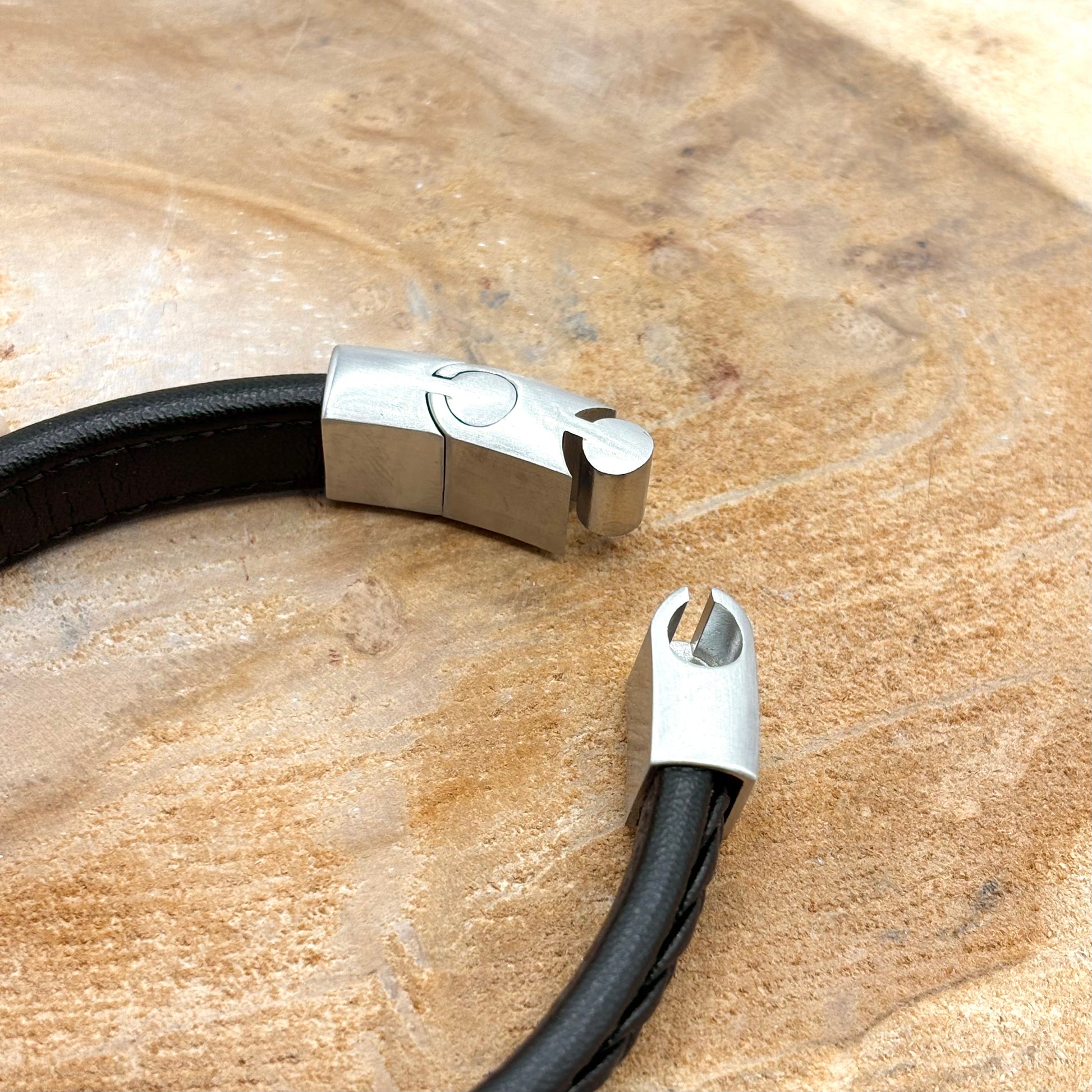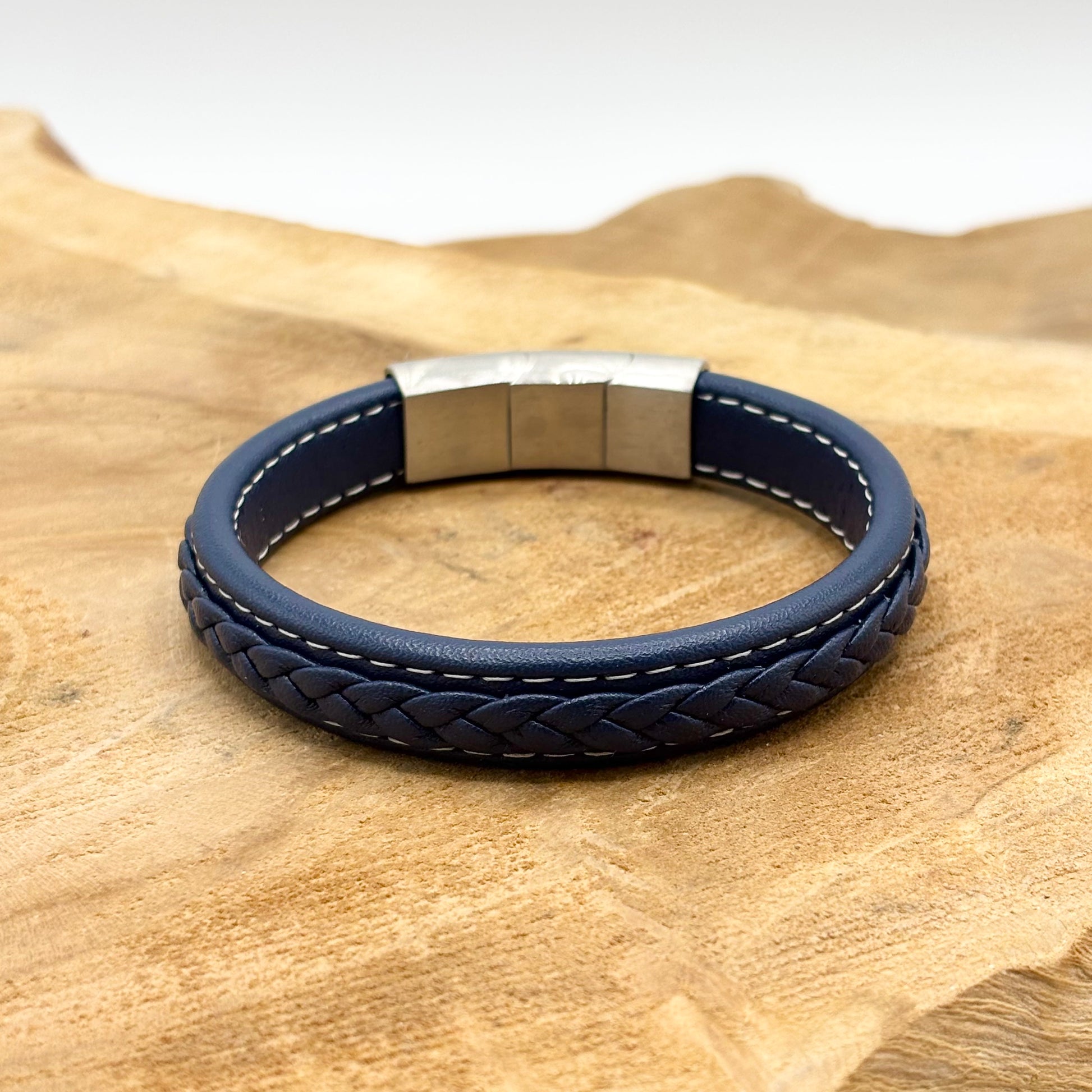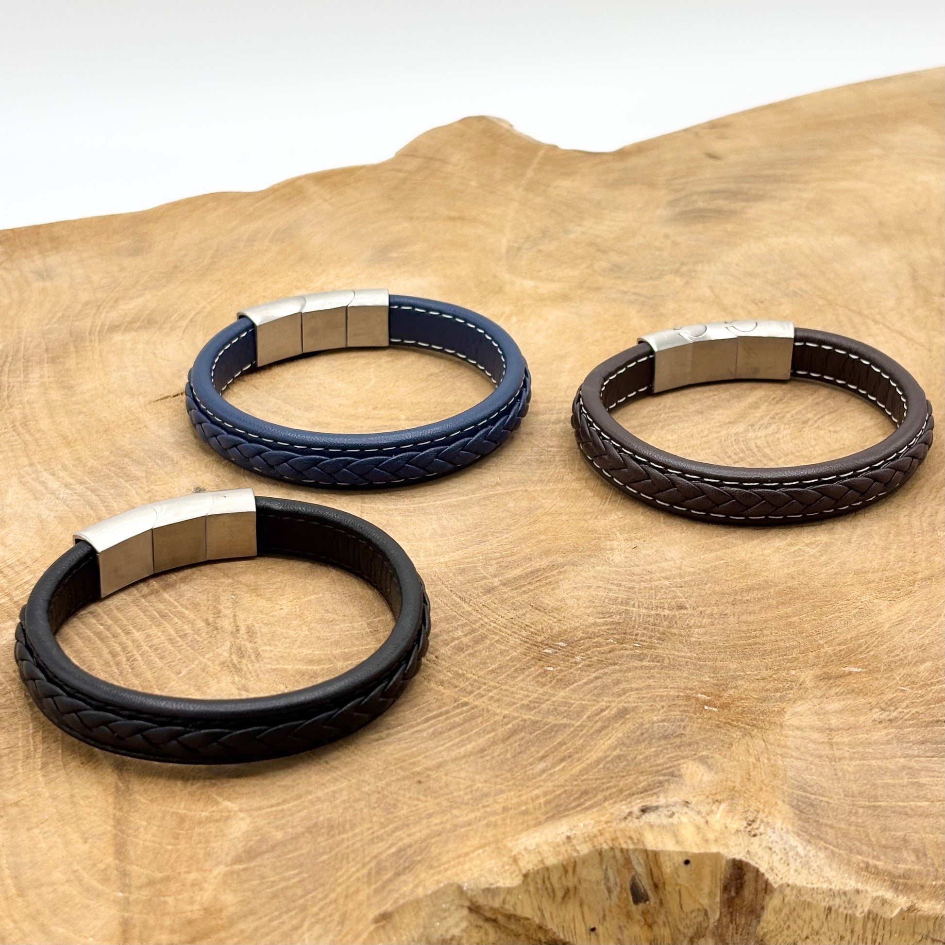 Bracelet en cuir avec un fermoir magnétique en acier inoxydable blanc, disponible en plusieurs couleur: noir, bleu ou marron.