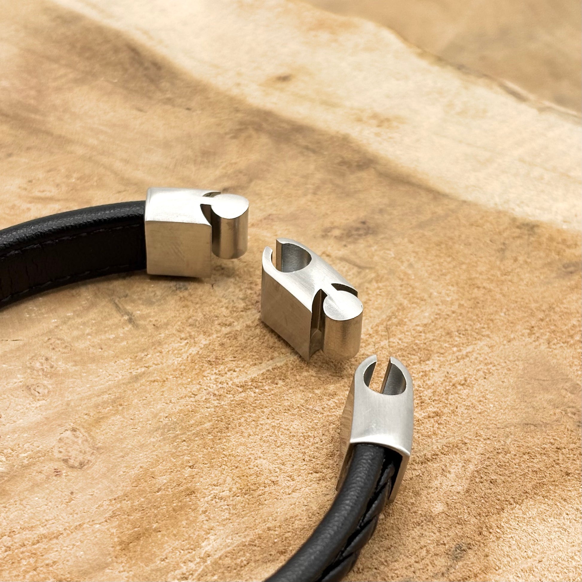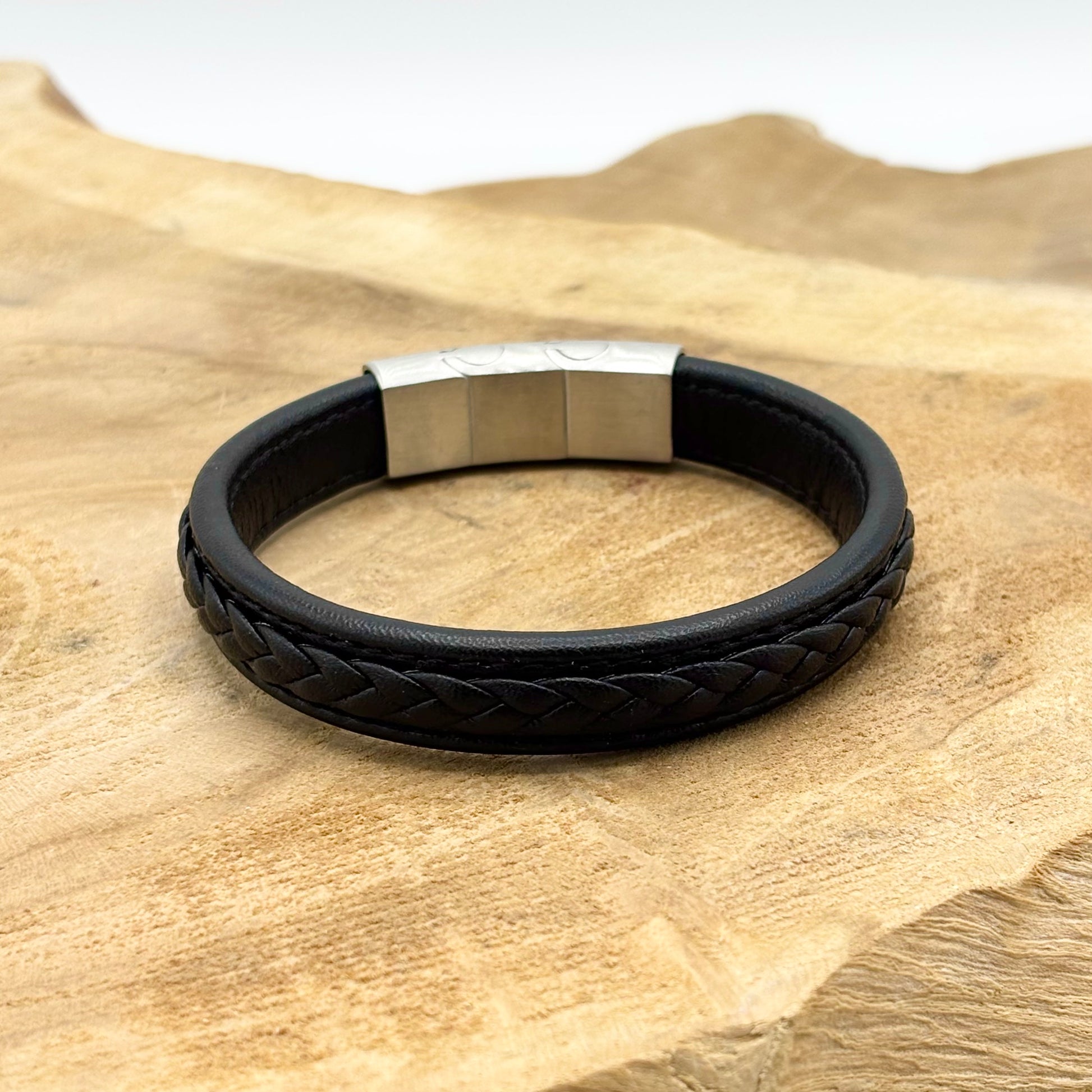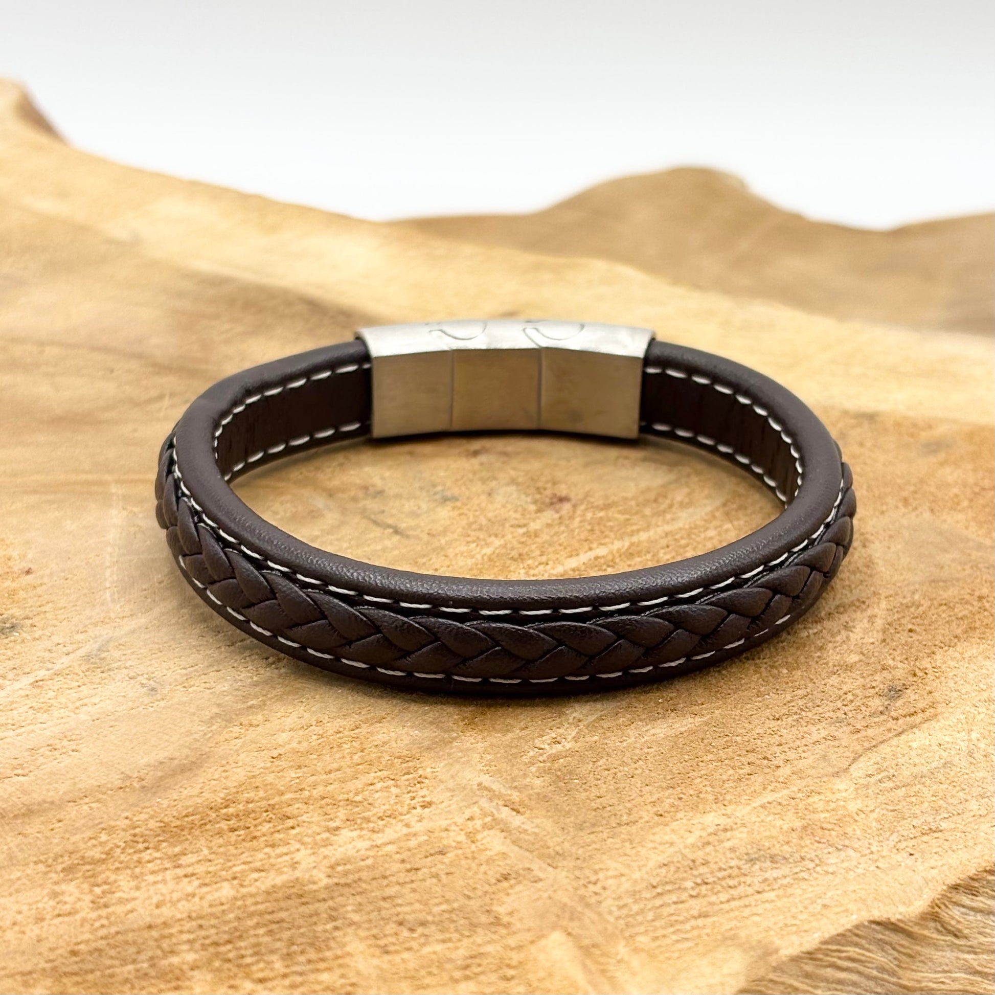 Bracelet en cuir avec un fermoir magnétique en acier inoxydable blanc, disponible en plusieurs couleur: noir, bleu ou marron.