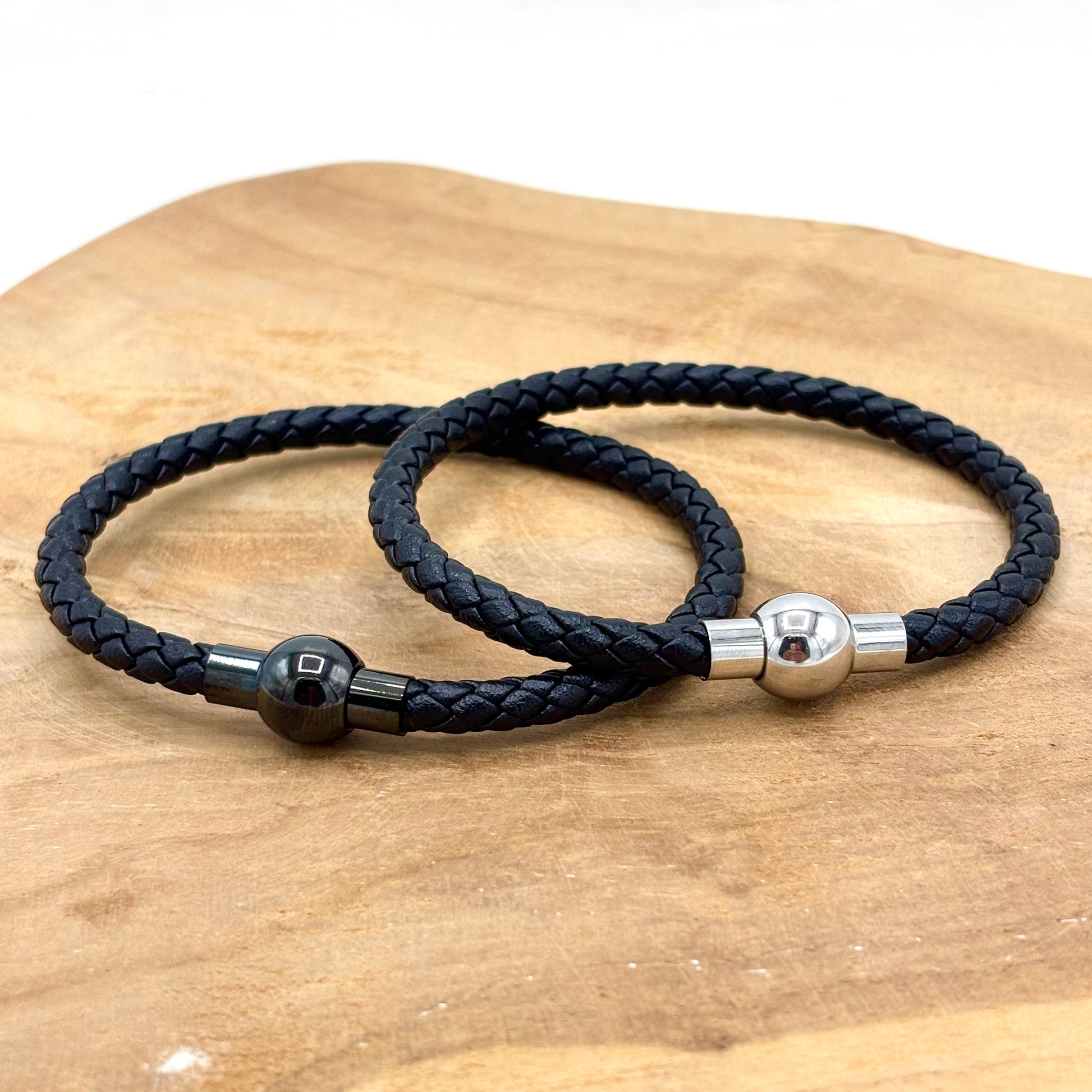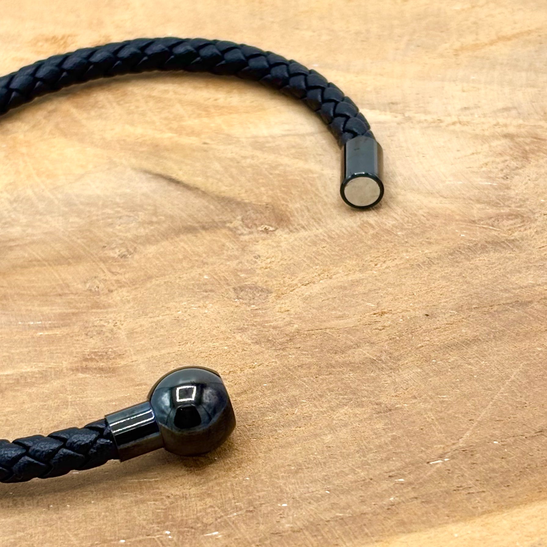 Bracelet homme en cuir noir avec un fermoir magnétique en acier inoxydable