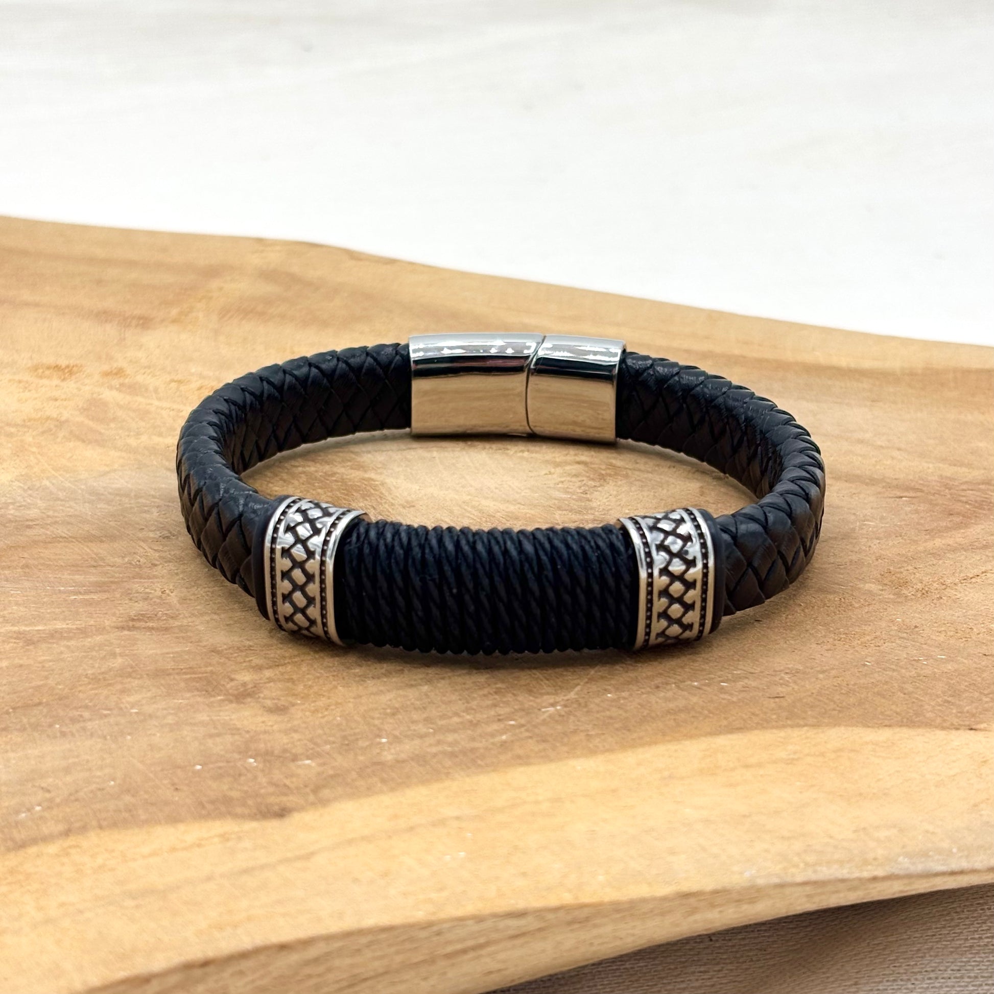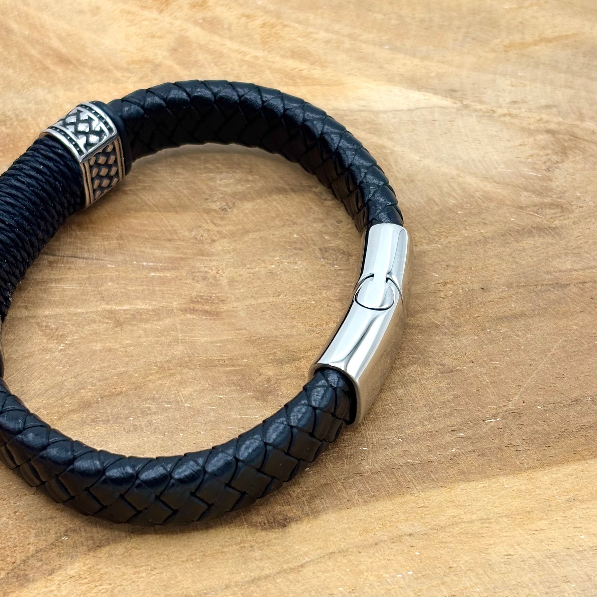 Bracelet homme en cuir noir tressé avec un fermoir aimanté en acier inoxydable blanc
