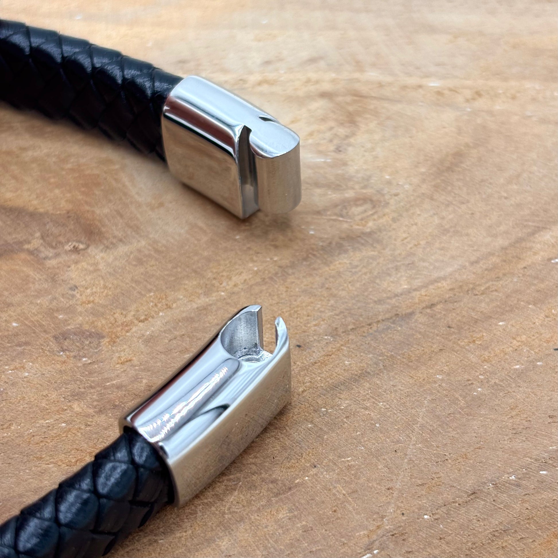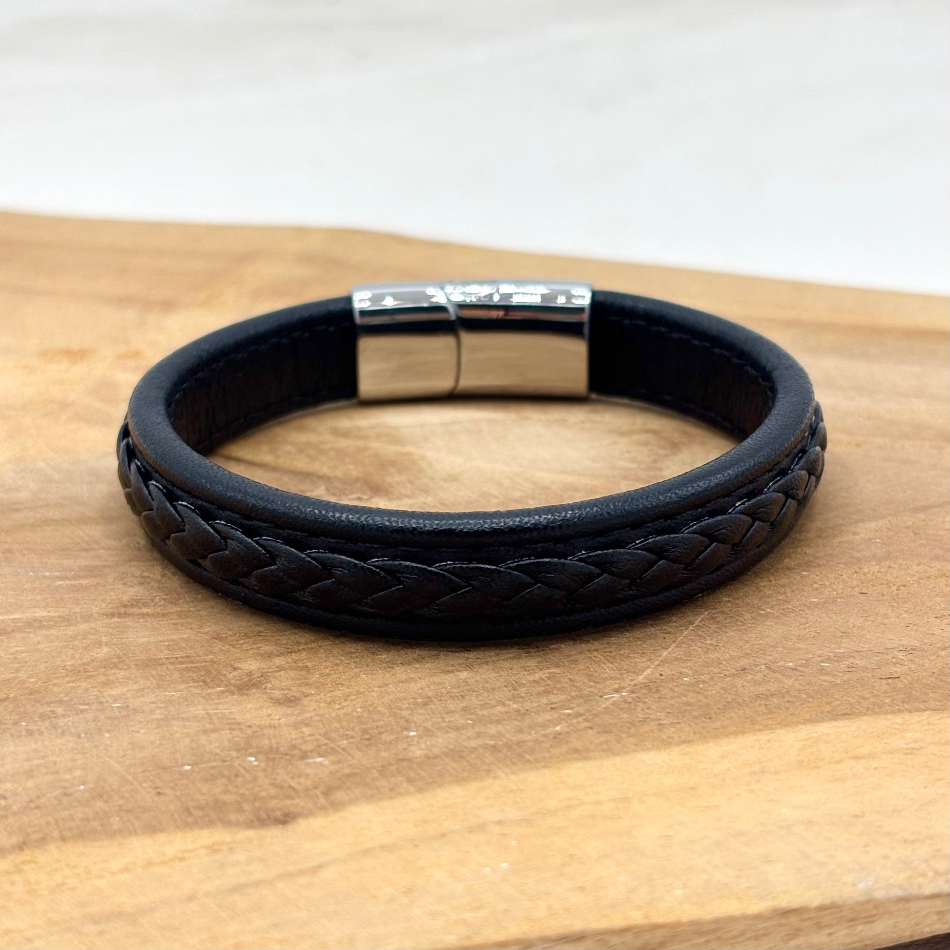 Bracelet homme en cuir noir tressé avec un fermoir aimanté en acier inoxydable blanc