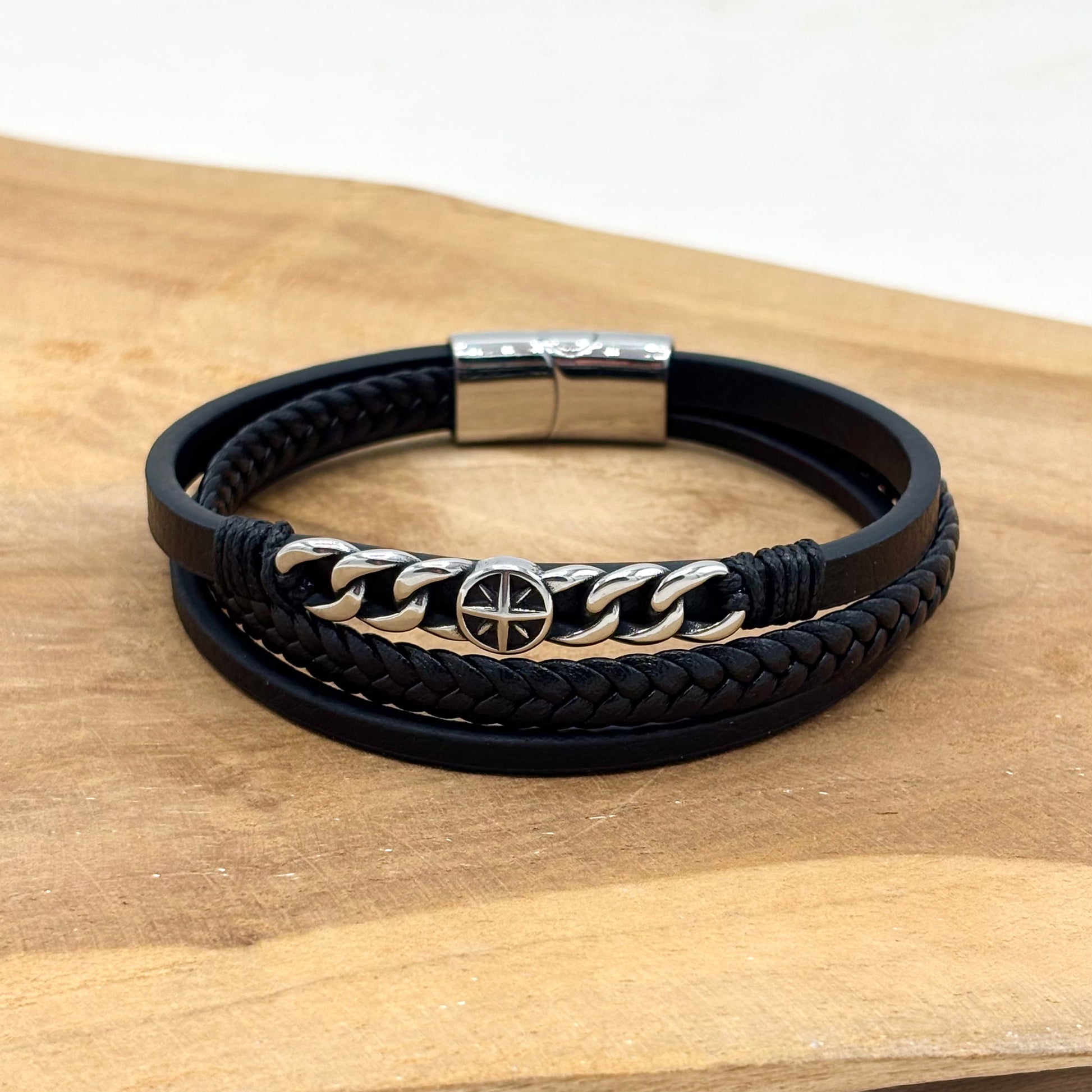 Bracelet homme en cuir noir tressé avec un élément décoratif en forme de rose des vents et fermoir aimanté en acier inoxydable blanc