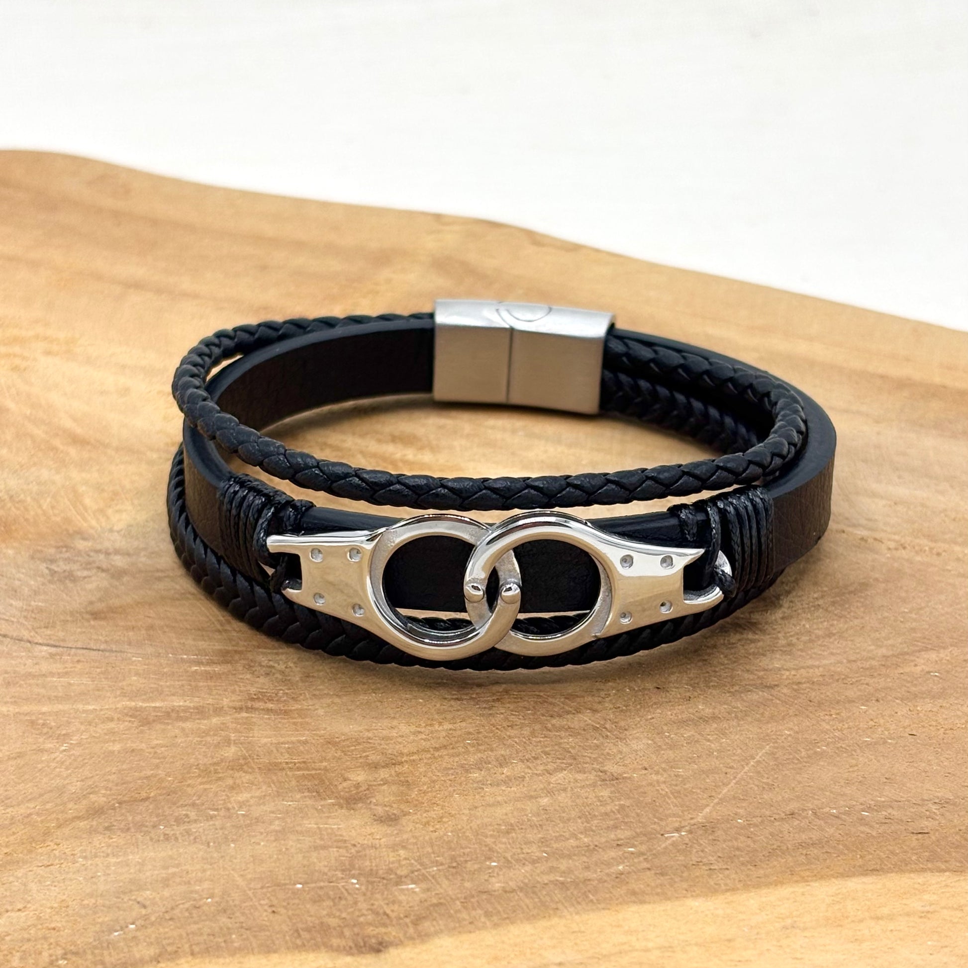 Bracelet homme en cuir noir tressé avec un élément décoratif en forme de chaînes et un fermoir aimanté en acier inoxydable blanc