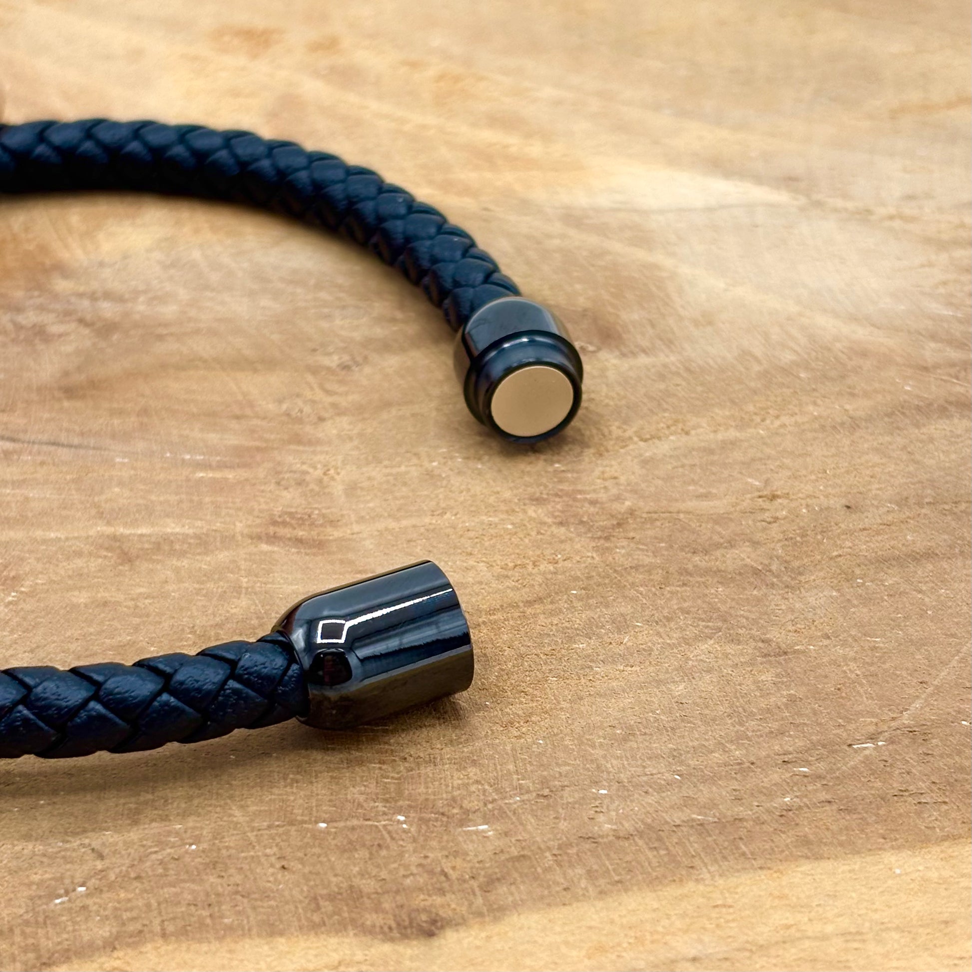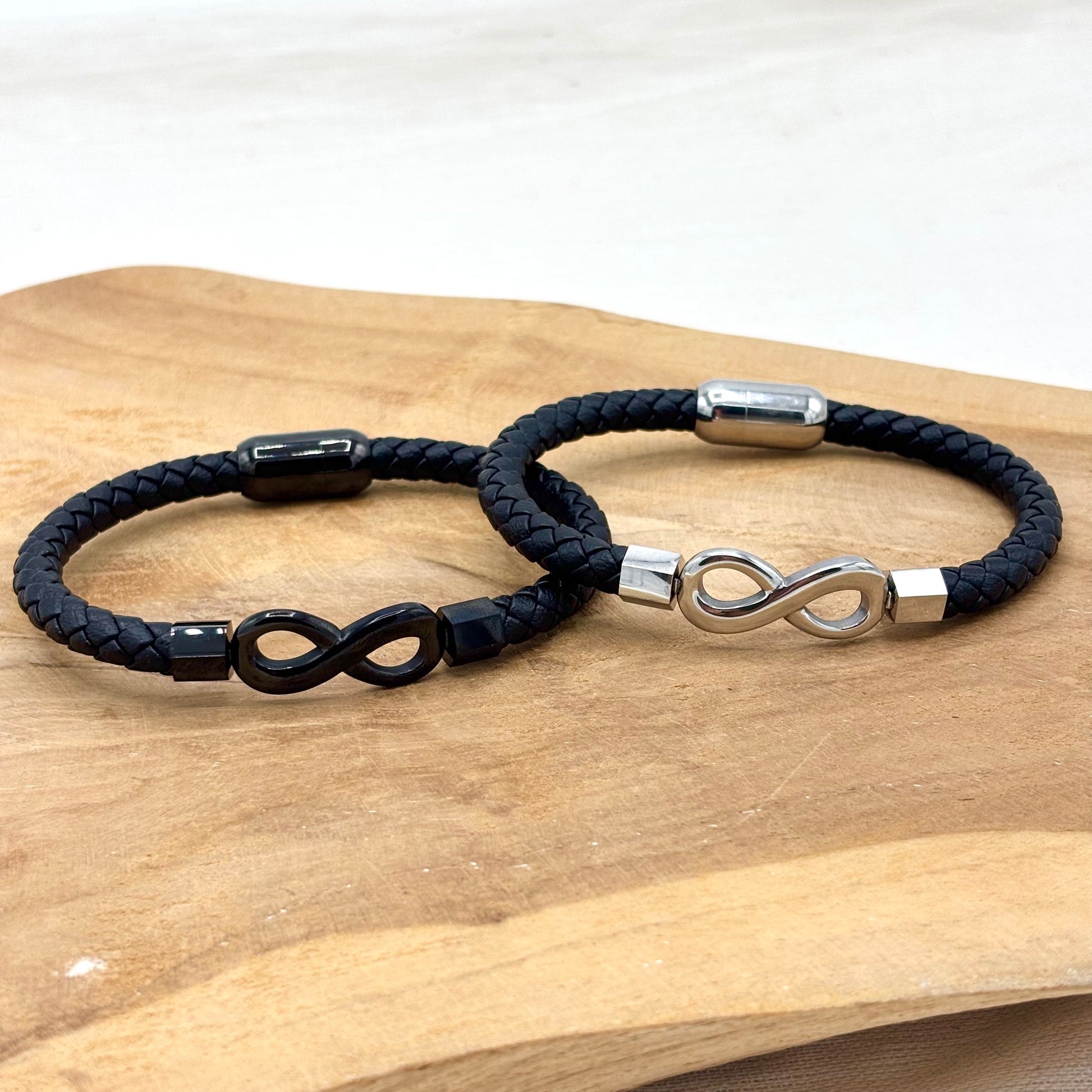 Bracelet homme en cuir noir tressé avec un signe infini en acier inoxydable et un fermoir magnétique