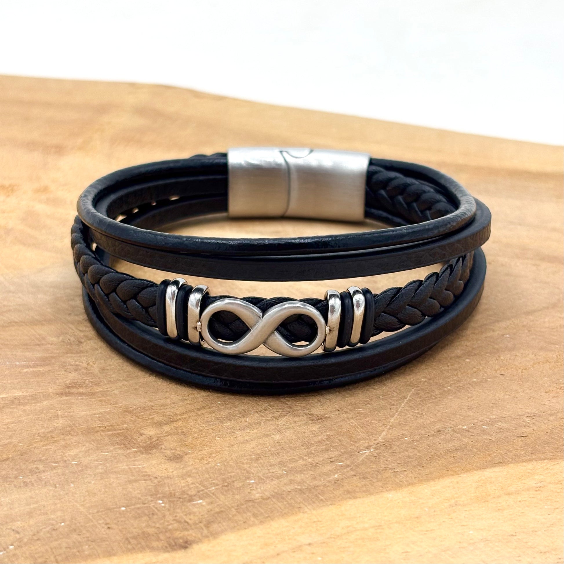 Bracelet homme en cuir noir tressé avec un élément décoratif infini et fermoir aimanté en acier inoxydable blanc